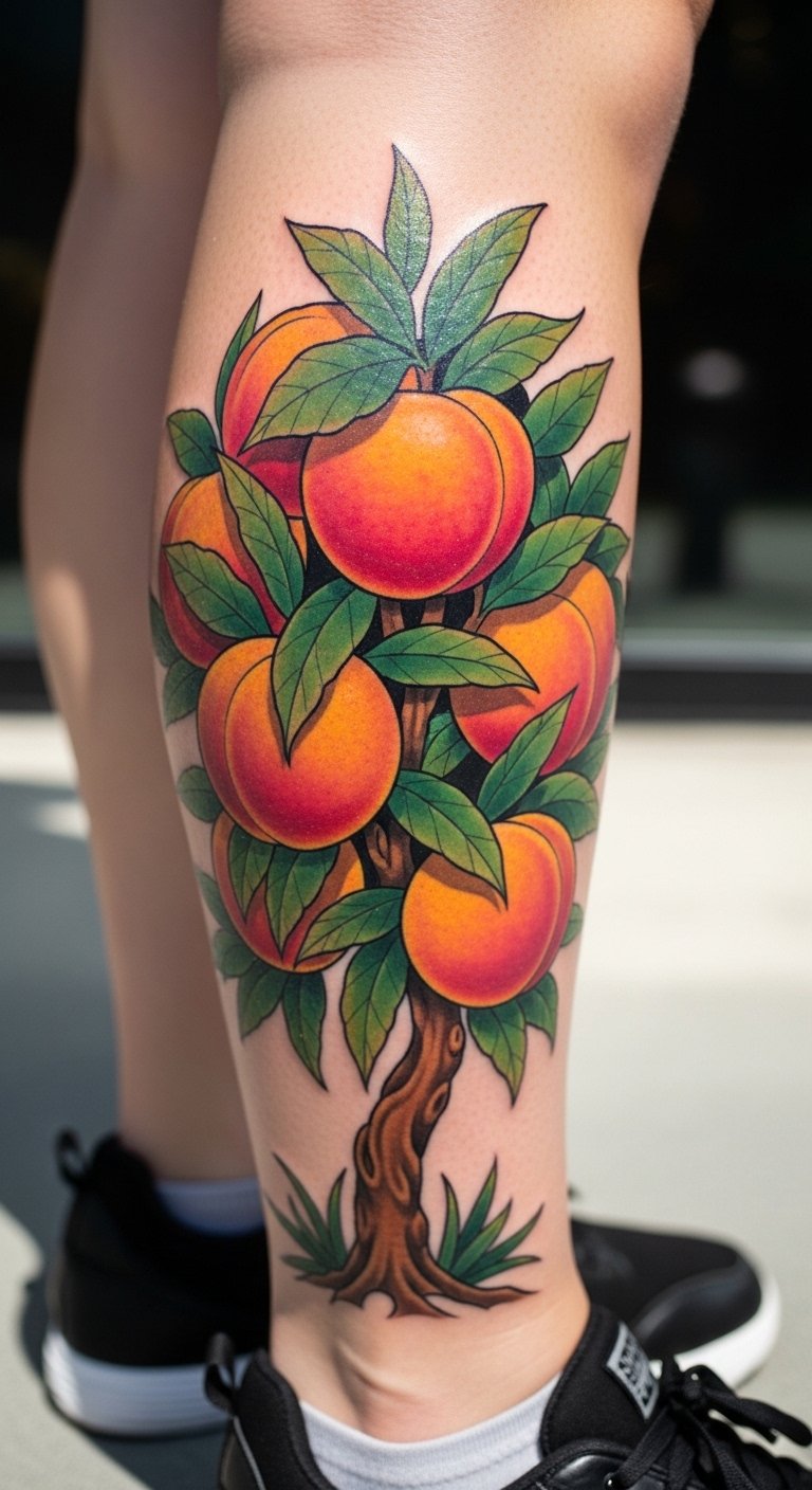 Grow your ink. A full-color peach tree on the calf tells a story. Add fruits and leaves. Costs $250. Draw trees in your sketchbook. Include personal elements. Discuss with pros. Wear compression for healing. Pants cover it. Simulate with markers.