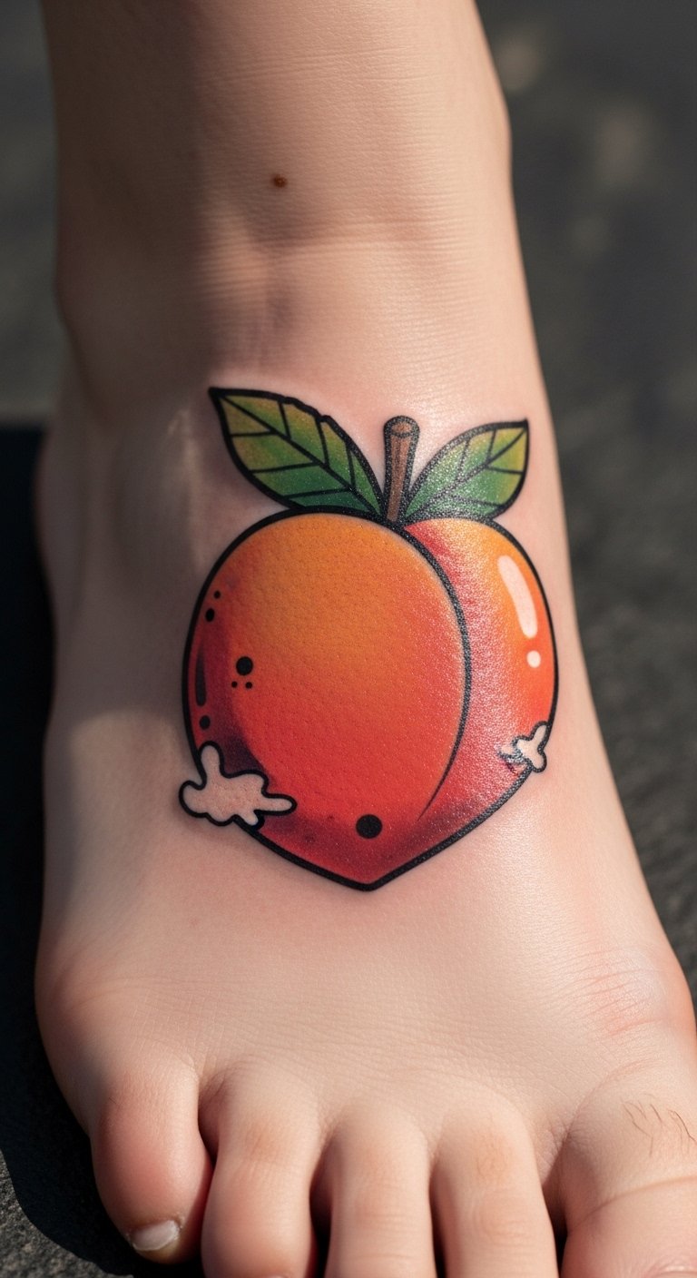 Fun and light. Cartoon peach on the foot brings smiles. Exaggerated features pop. Around $70. Cartoon sketches for practice. Add eyes or smiles. Customize fun. Artists make it playful. Shoes hide it. Use kid’s crayons for ideas.