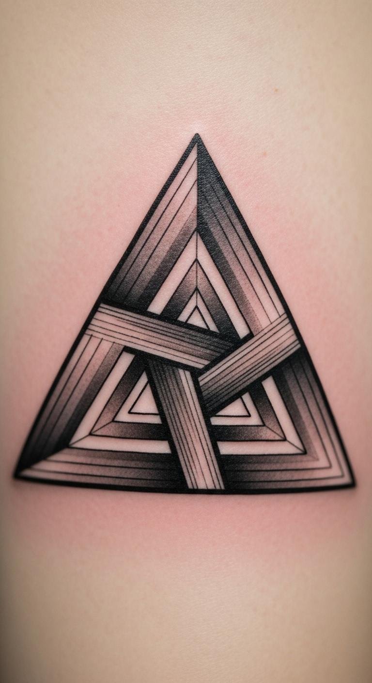 Keep it small and subtle. A minimalist Penrose Triangle on your ankle means fewer details and quicker sessions. Grab a pen and trace a basic triangle on your skin to see how it fits. Download free tattoo templates online to adjust sizes. Find an affordable artist through community forums. Use henna kits for a temporary version that lasts weeks. This spot hides easily under socks. Pair it with daily outfits for fun. Bold the key: simple lines stand out. Add a dot or two with washable ink at home. It’s perfect for first-timers. Check local shops for deals on small tattoos. Practice drawing on paper first. You’ll get a design that feels personal and low-key.