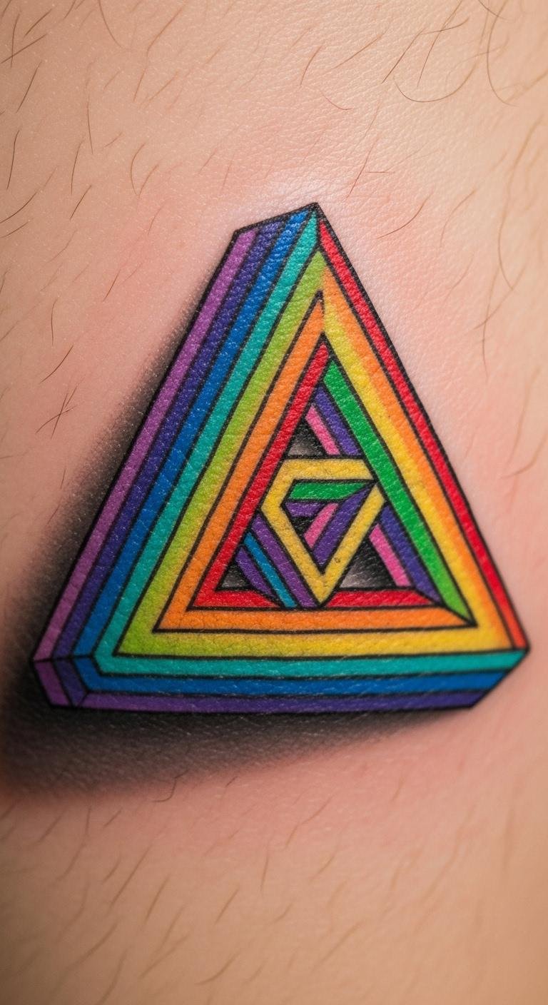 Bring in some color. A gradient Penrose Triangle adds shades like blue to red for a dynamic look. Start by mixing watercolors at home to mimic the effect. Search free apps for color overlay ideas. Chat with artists about affordable ink options. Try fabric markers on a shirt to preview it. This idea pops on your arm. Use everyday items like colored pencils for sketches. Bold this: gradients create depth. Keep costs down by sticking to one or two colors. It’s great for expressing moods. Draw on paper with crayons first. You’ll have a tattoo that changes with light.