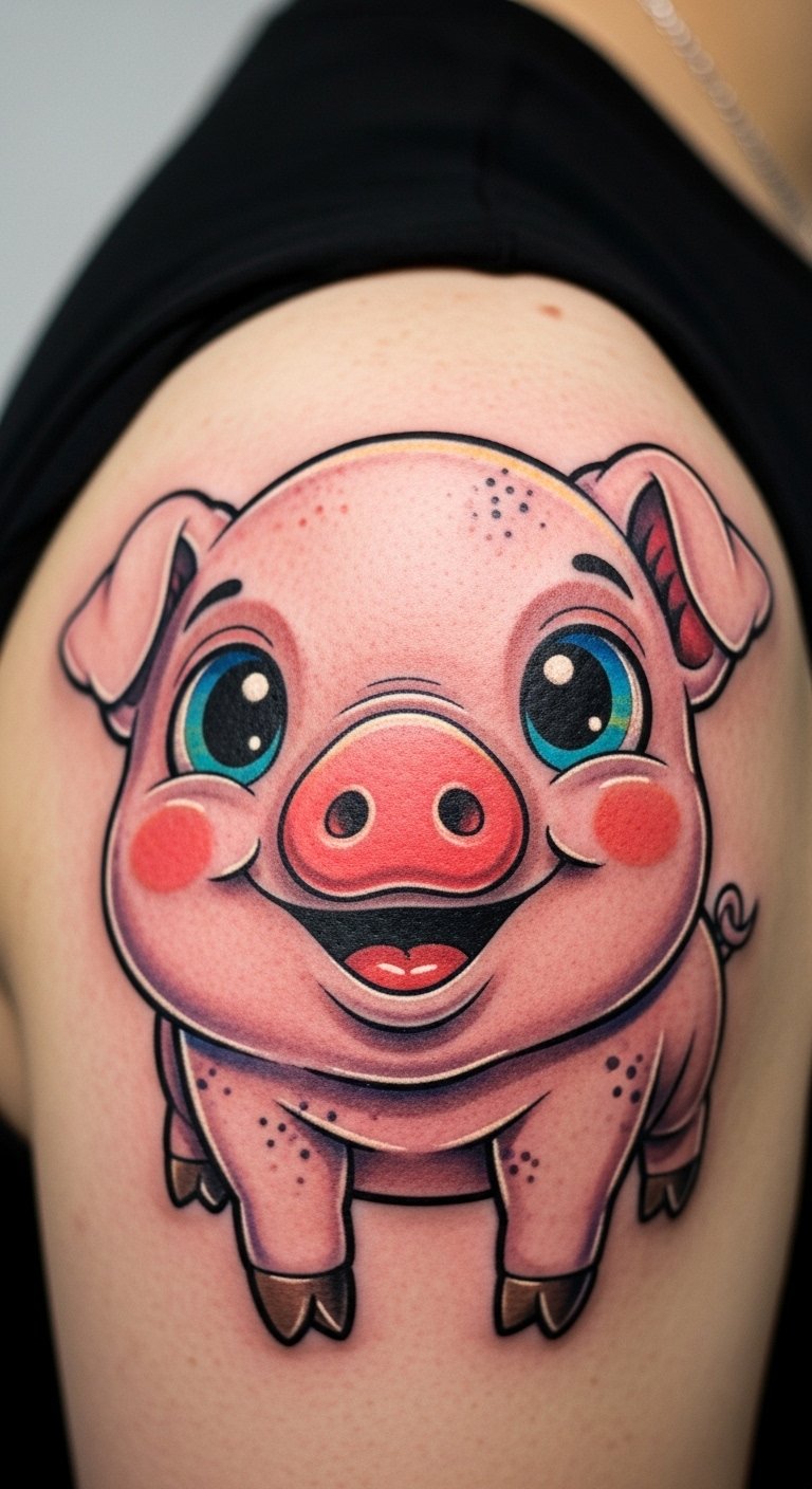 A cartoonish piglet tattoo brings joy to your body art. It looks adorable and fun. Draw your own version with colored pencils on paper. Find free apps for digital sketches. Aim for bright hues like pink and blue. A small one costs around $60 at a shop. Place it on your arm for easy viewing. Add stars or hearts around it. This style suits daily wear. Use temporary tattoos to try it out. They cost just a few dollars. Keep the design simple to cut time. You’ll feel happy every day. Mix it with other farm themes. It’s a budget-friendly choice.