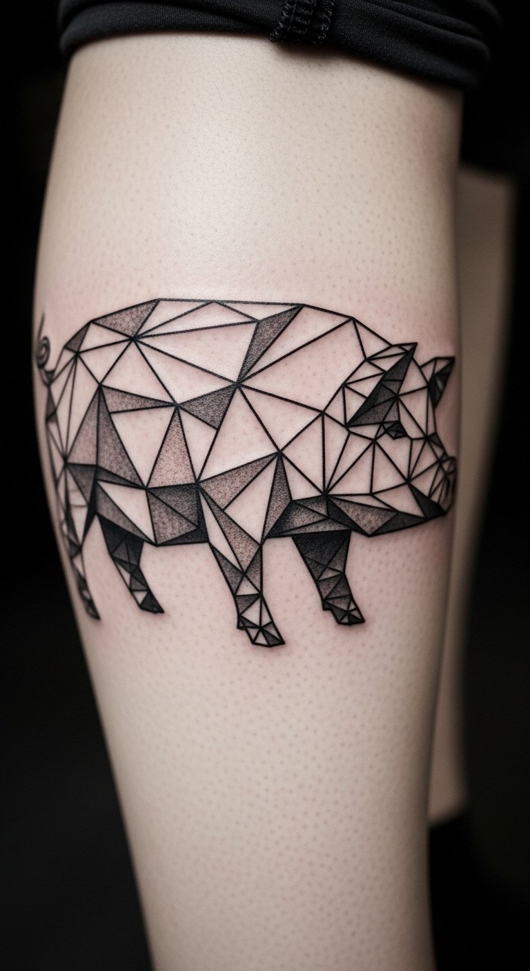 Try a geometric pig shape for an artistic edge. It uses shapes like triangles. Sketch it using graph paper at home. Free tutorials online help a lot. A session might cost $80 total. Position it on your leg for balance. Combine with dots or lines. This design pops in photos. Use string art as a DIY model. Materials cost pennies. Keep patterns symmetrical. It’s fun and meaningful. Adapt it to your taste. This idea works on a shoestring.