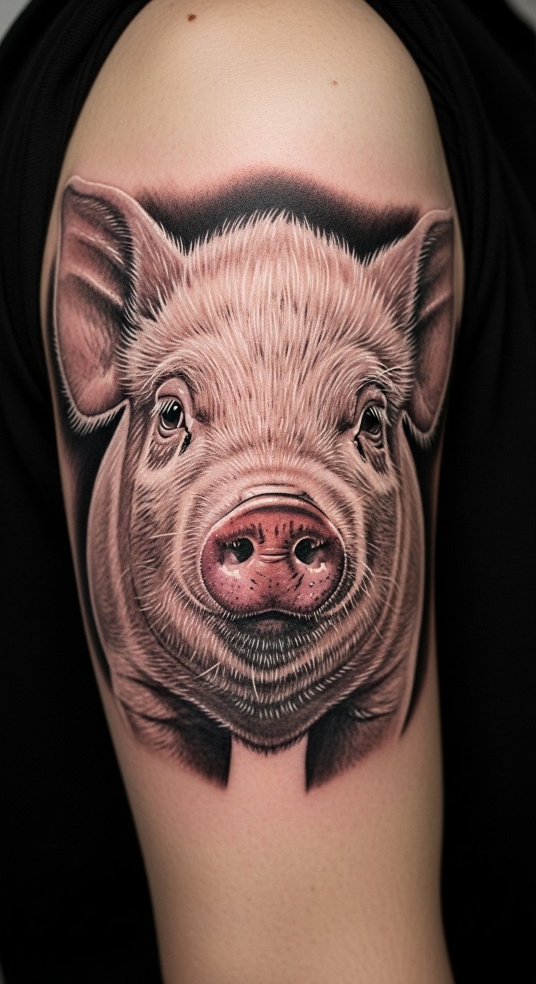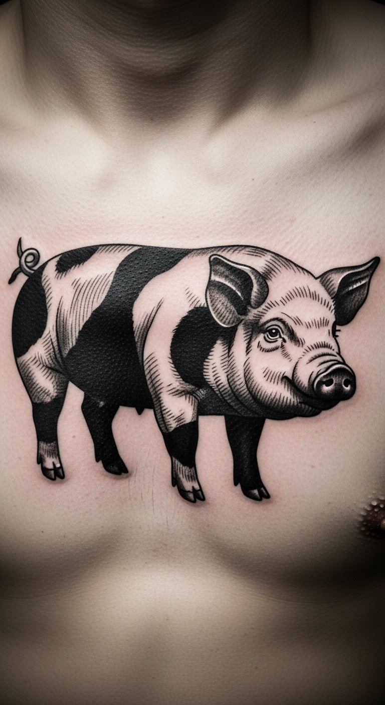 A farm animal pig combo tells a story. It mixes pigs with cows or chickens. Draw a rough version on paper. Gather ideas from farm books. This tattoo is around $90. Put it on your thigh for space. Add rustic details like fences. It’s perfect for nature lovers. Practice with clay models at home. Supplies are under $5. Use bold colors if you want. This design feels nostalgic. Make it your own easily.