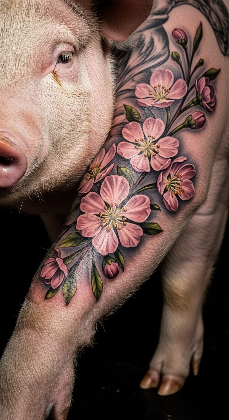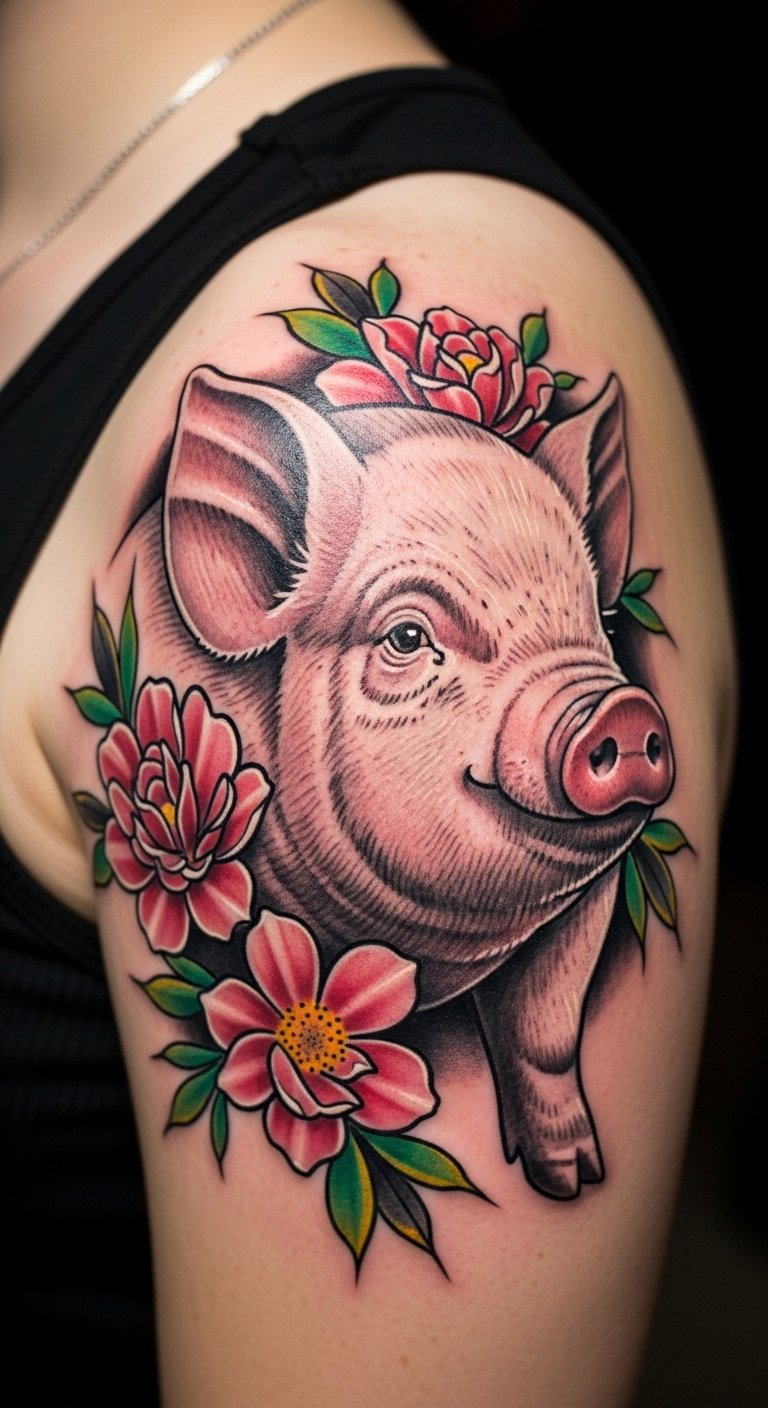 Floral pig integration blends beauty and whimsy. Flowers wrap around the pig. Sketch flowers from your garden. Free guides online assist. This design costs $70. Put it on your shoulder for elegance. Mix roses or daisies in. It’s feminine and fresh. Try flower stencils at home. Paper and markers suffice. Keep the layout balanced. This idea enhances your look affordably.