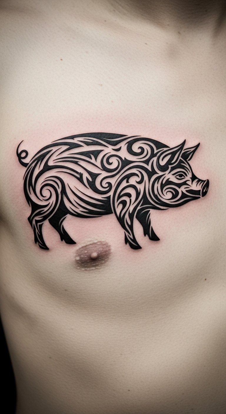 Abstract pig art offers creative freedom. Swirls and shapes form the pig. Experiment with abstract drawings. Blank paper helps. This tattoo is around $80. Place it on your rib for privacy. Layer colors creatively. It’s unique and modern. Use paint swatches for ideas. Supplies cost little. Focus on fluid lines. This design sparks imagination.