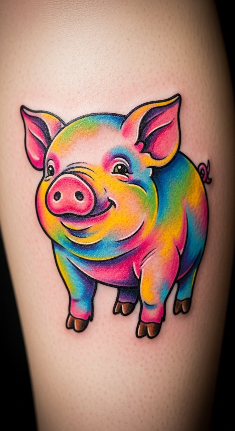 Colorful pig tattoos pop with energy. Use reds and yellows. Plan colors with markers at home. Online palettes guide you. Expect $90 for vibrancy. Position it on your leg for fun. Mix in patterns. It’s eye-catching and bold. Practice with colored paper. Items are cheap. Keep the palette simple. This idea lifts your spirit.