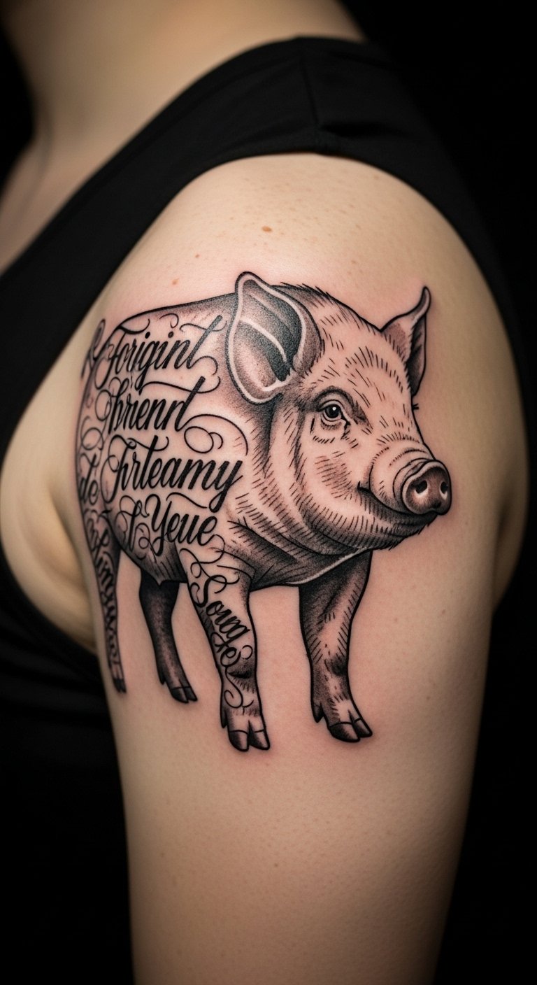 Pig tattoo with name integration personalizes it. Add your name nearby. Write it in simple script. Free fonts online help. Expect $70. Position it on your shoulder. Include family names. It’s sentimental and unique. Try name tags for tests. They cost little. Keep text clear. This idea tells your story.