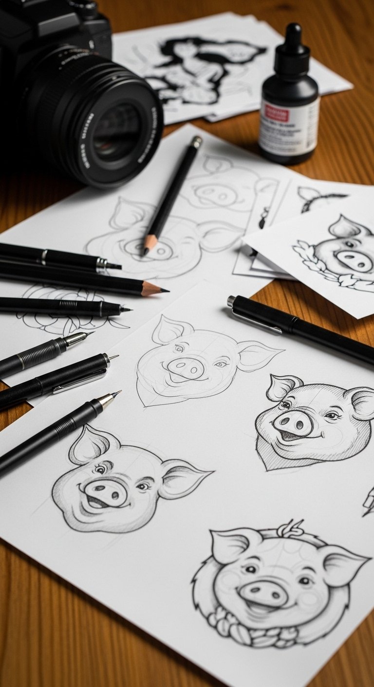 DIY pig tattoo sketching lets you create first. Use pens and paper. Follow easy online steps. This saves money upfront. Start at your desk. Add your twists. It’s hands-on and fun. Gather basic supplies. They are under $10. Practice daily sketches. This approach builds skills.