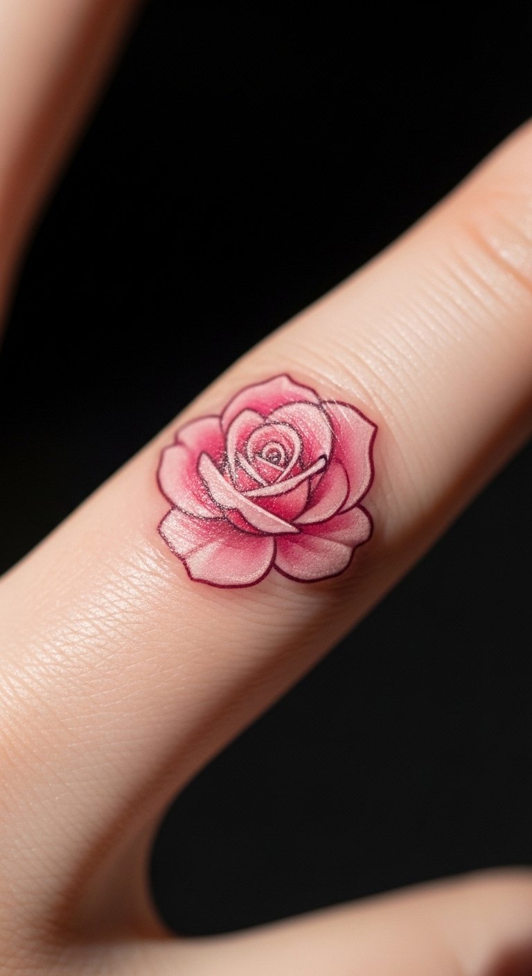 A pink rose on your finger keeps things simple and sweet. Think of it as a daily reminder of something special, like a secret promise. Start with a sketch on paper to visualize it. For budget tips, use free online tattoo design apps to experiment before visiting an artist. Pick a local shop with affordable rates, often under $50 for small pieces. Break it down: choose light pink ink for a softer look. Add a personal touch by drawing your own rose sketch at home with markers. Keep sessions short to save money. This design fits everyday wear, hiding easily under rings. Go for a single-session appointment to cut costs. Practice drawing roses on paper for DIY ideas. You’ll end up with a tattoo that feels uniquely yours. Focus on clean lines for the best result. Find an artist who uses cost-effective materials. Make it meaningful by tying it to a personal story. This approach lets you express yourself without breaking the bank.
