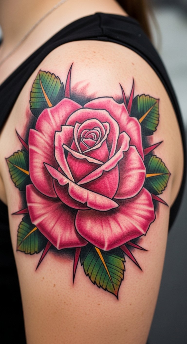 A bold pink rose on your shoulder makes a statement without overwhelming your look. Picture vibrant petals that pop against your skin, perfect for showing off in a tank top. Sketch ideas on your arm first to see how it flows. Save money by choosing a smaller size, keeping costs around $100–200. Use phone apps to design variations at no charge. Opt for one color to simplify the process. Add thorns for a personal edge, drawing them freehand on paper. Schedule during off-peak times for lower prices. This placement works well for active lifestyles, staying hidden under clothes when needed. Get feedback from friends on your sketches to refine it. Focus on clear outlines for easy touch-ups later. Pick an artist who offers package deals. You’ll have a piece that boosts your confidence every day. Try temporary tattoos first to test it out. Keep the design straightforward for quick sessions.