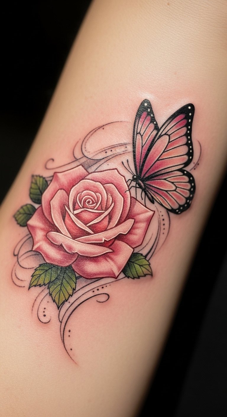 Pairing a pink rose with a butterfly creates an elegant vibe on your skin. Imagine the rose as a symbol of beauty, with the butterfly adding a touch of freedom. Draw both elements on paper to blend them just right. For affordable options, look for artists who do combo designs at reduced rates, around $150. Use free drawing tools online to mix ideas. Place it on your wrist for easy viewing. Add simple lines to the butterfly for a DIY feel. Book a quick appointment to avoid extra fees. This tattoo suits special occasions, peeking out from sleeves. Experiment with sketches using household pens. Choose lighter shades to make it versatile. Find local events where artists offer discounts. You’ll enjoy a design that tells a story without much fuss. Keep the size modest for faster healing. Practice combining shapes at home for fun.