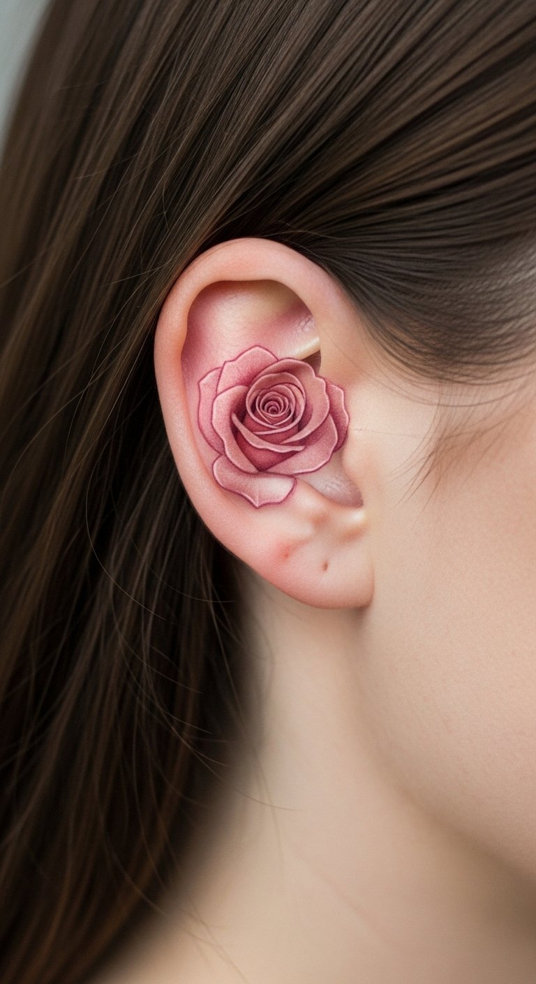A subtle pink rose behind your ear offers a hidden gem of style. It’s perfect for those quiet moments of reflection. Start by tracing a small design on your neck with a marker. Budget wisely by opting for a tiny version, costing less than $80. Download free tattoo apps to preview it. Position it low for easy concealment under hair. Add a few petals for a personal twist, sketching them yourself. Choose an evening slot for cheaper rates. This spot works for professional settings, staying out of sight. Test with temporary stickers from dollar stores. Keep the ink pale for a softer effect. Look for walk-in shops with deals. You’ll have a meaningful mark that’s all yours. Make sure the lines are smooth for longevity. Draw inspiration from nature walks for ideas.