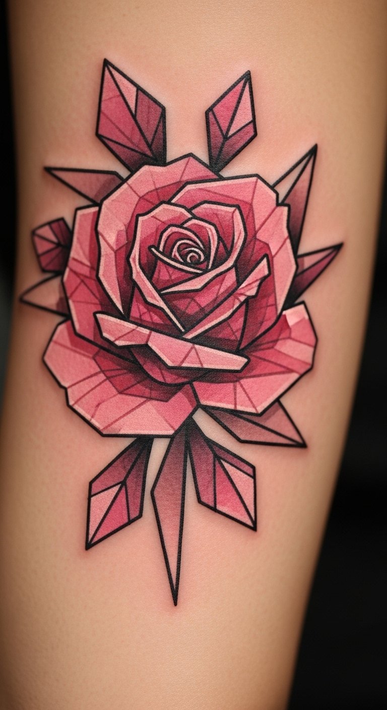 A modern pink rose with geometric shapes mixes art and edge. Imagine sharp lines framing soft petals. Start by outlining on grid paper for accuracy. Budget by picking a compact version, under $150. Explore free graphic apps for custom layouts. Place it on your shoulder for impact. Incorporate triangles for a cool effect, sketching them yourself. Look for mid-week deals at studios. This design works for creative types, adding a modern twist. Test with printable templates. Use contrasting shades for depth. Seek out affordable custom options. You’ll find it elevates your look effortlessly. Keep the geometry simple for quick work. Experiment with shapes at your desk.