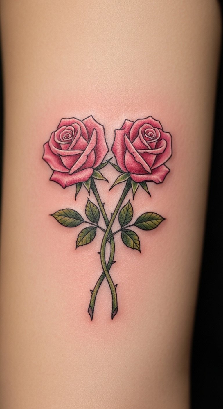 A pink rose pair for couples symbolizes shared bonds. View it as a permanent link between two people. Draw matching sketches together for fun. Save money by getting them done in one visit, around $200 total. Use couple apps to design collaboratively for free. Position one on each wrist for symmetry. Add linking elements like vines, creating them at home. Find duo specials at local shops. This tattoo suits date nights, showing your connection. Try matching temporary ones first. Opt for similar shades for harmony. Check for package rates. You’ll cherish the shared meaning. Focus on identical details for balance. Plan it as a joint activity.