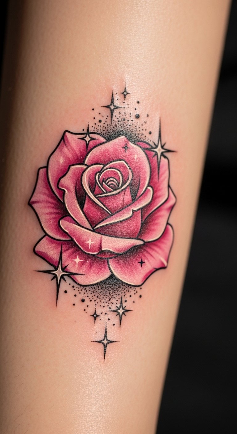 A mystical pink rose with stars adds a dreamy touch. Picture stars around the petals for a night sky vibe. Map it out on star charts for inspiration. Budget by choosing a small scale, about $130. Download free starry templates online. Put it on your back for a surprise element. Include constellations you like, drawing them yourself. Schedule for slower days to cut costs. This design fits stargazing enthusiasts, hidden under clothes. Use glow-in-the-dark stickers to test. Pick soft pinks for a magical look. Look for thematic artists with deals. You’ll enjoy the wonder it brings. Keep stars simple for ease. Create your own mock-up at night.