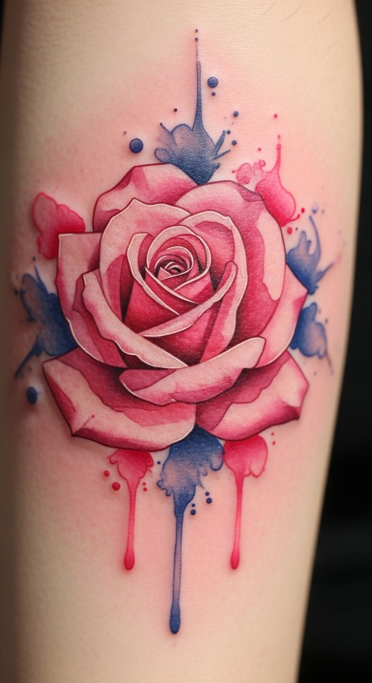 A playful pink rose in watercolor style brings fun to your skin. See the blended colors as a burst of creativity. Experiment with watercolors on paper first. Keep expenses low with a basic design, around $110. Access free painting apps for ideas. Place it on your forearm for visibility. Add splashes for whimsy, trying it at home. Find artists who offer splash effects cheaply. This tattoo matches artistic outfits, adding color. Test with washable paints. Use varying hues for movement. Seek budget watercolor specialists. You’ll love the fresh feel. Focus on light layers for subtlety. Play around with brushes for practice.
