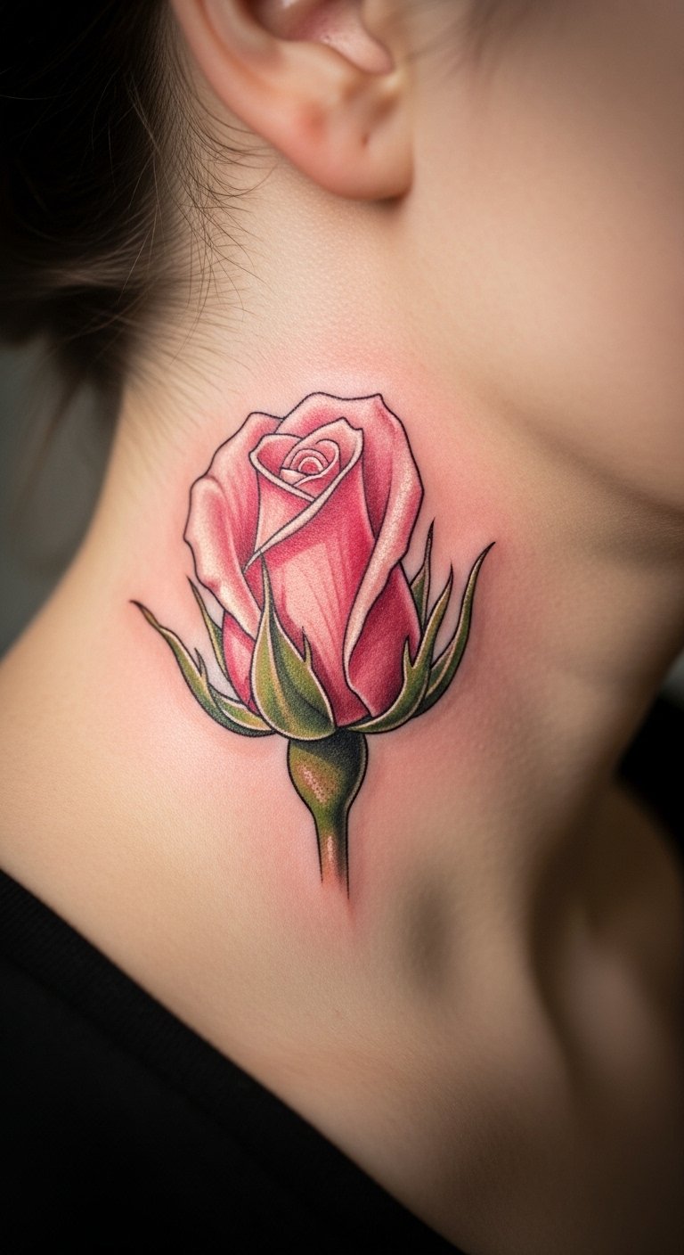 A sweet pink rose bud on your neck whispers subtlety. See it as a budding idea waiting to bloom. Trace it on your neck with makeup for a trial. Budget with a micro design, around $90. Download free bud templates. Hide it under collars for versatility. Add tiny details like dew drops, drawing them yourself. Schedule for quick sessions to save. This tattoo works for professional looks, peeking out occasionally. Try adhesive versions first. Use pale ink for softness. Find neck specialists with low fees. You’ll enjoy its quiet charm. Focus on smooth curves. Sketch buds from garden walks.