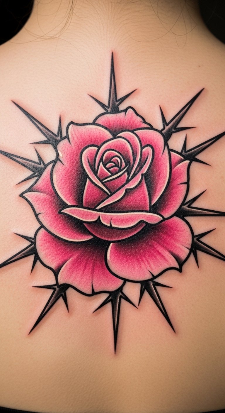 A fierce pink rose with thorns on your back shows strength. Picture the thorns as protectors of your story. Map it on your back with chalk for placement. Keep costs down with a focused design, about $160. Use free thorn drawing apps. Position it centrally for symmetry. Add personal symbols, sketching them at home. Look for back deals at studios. This tattoo suits adventurous spirits, covered when needed. Test with body paint. Choose vivid colors for impact. Seek artists with thorn expertise. You’ll feel empowered by it. Emphasize sharp lines. Draw inspiration from nature.