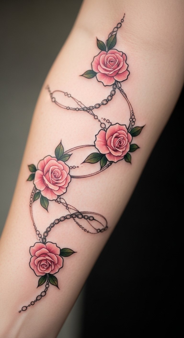 A graceful pink rose chain on your arm creates a flowing path. Think of it as a series of connected moments. Chain ideas on paper to see the flow. Budget by making it a line design, around $130. Access free chain templates online. Wrap it around your arm for a bracelet effect. Add links you like, drawing them yourself. Find chain specials for savings. This tattoo pairs with jewelry, enhancing your style. Use string to simulate first. Opt for light shades for delicacy. Check for arm packages. You’ll love the movement it brings. Keep connections smooth. Practice with string art.
