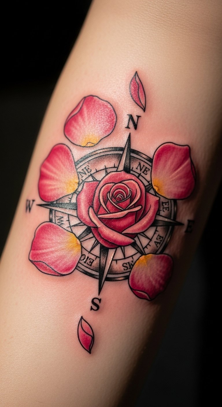 An adventurous pink rose with a compass guides your path. See the compass as a symbol of direction. Combine elements on maps for ideas. Save by integrating simple tools, about $140. Use free compass apps for designs. Place it on your leg for travel vibes. Add directional lines, drawing them at home. Look for adventure-themed deals. This tattoo fits explorers, reminding of journeys. Try map stickers. Choose bold accents. Find thematic artists. You’ll feel directed by it. Keep the compass accurate. Sketch from travel maps.