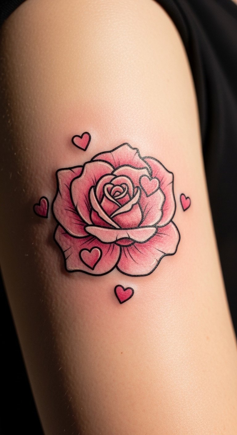 A whimsical pink rose with hearts adds joy to your skin. See hearts as bursts of happiness. Mix shapes on paper for fun. Save with a light-hearted design, about $120. Use free heart apps for ideas. Place it on your hand for visibility. Add more hearts, drawing them yourself. Look for playful specials. This tattoo fits festive events, showing cheer. Try heart stickers. Choose bright pinks. Find whimsical artists. You’ll smile at the whimsy. Keep it lively. Practice with doodles.