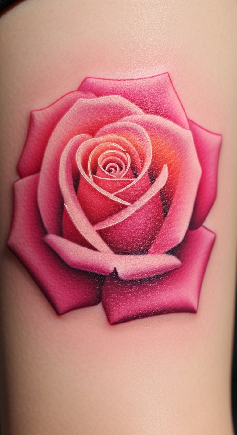 A colorful pink rose gradient adds depth with shades. Imagine the fade as a color journey. Blend colors on paper for practice. Save with a gradient focus, about $110. Use free shade apps. Position it for show. Add transitions you like, drawing them. Find gradient specials. This tattoo suits color lovers, dynamic and fun. Test with markers. Opt for smooth blends. Check for shade deals. You’ll enjoy the variation. Keep it flowing. Experiment with paints.