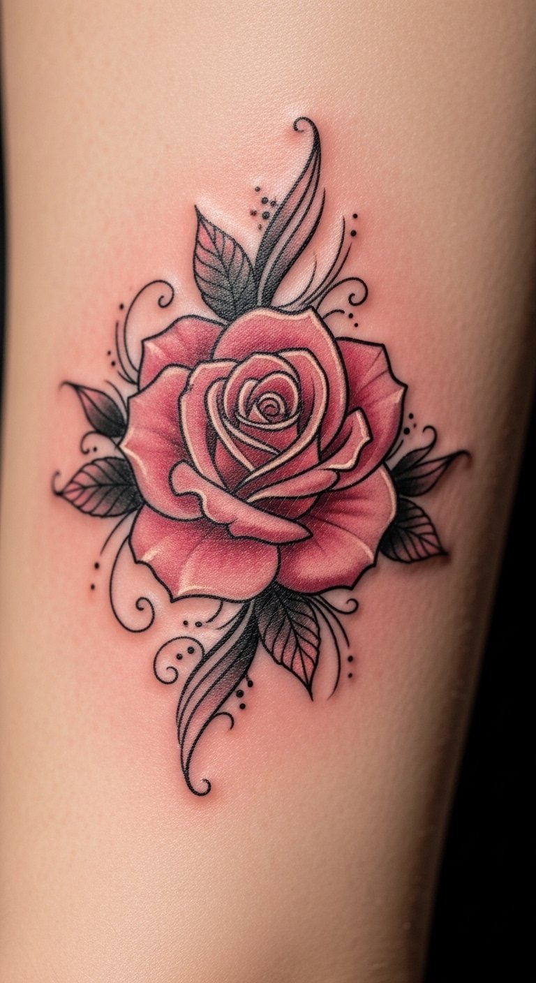 A minimal pink rose outline keeps it clean and clear. See it as essential elegance. Draw outlines on paper to perfect it. Budget with a line-only version, under $70. Access free outline tools. Place it anywhere for flexibility. Add just enough for meaning, yourself. Look for quick line deals. This tattoo fits minimalists, easy to adapt. Try outline pens. Choose fine lines. Find basic artists. You’ll appreciate the simplicity. Focus on precision. Sketch quickly.