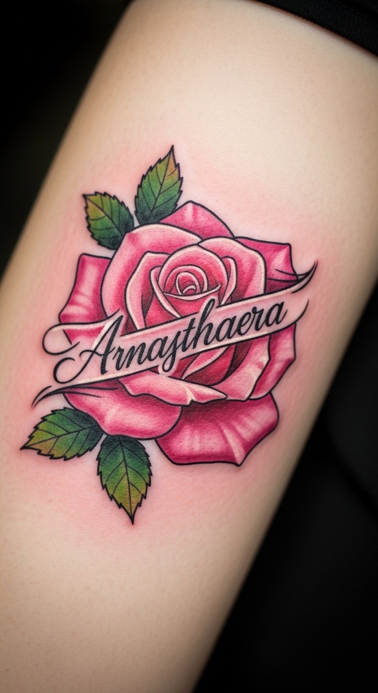 A personalized pink rose with a name makes it yours. Think of the name as a key element. Write names in the design on paper. Save with text addition, about $140. Use free personalization apps. Integrate it smoothly. Add fonts you prefer, drawing them. Find custom deals. This tattoo suits family ties, making it unique. Test with labels. Opt for clear script. Seek name specialists. You’ll cherish the personalization. Keep text legible. Practice handwriting.
