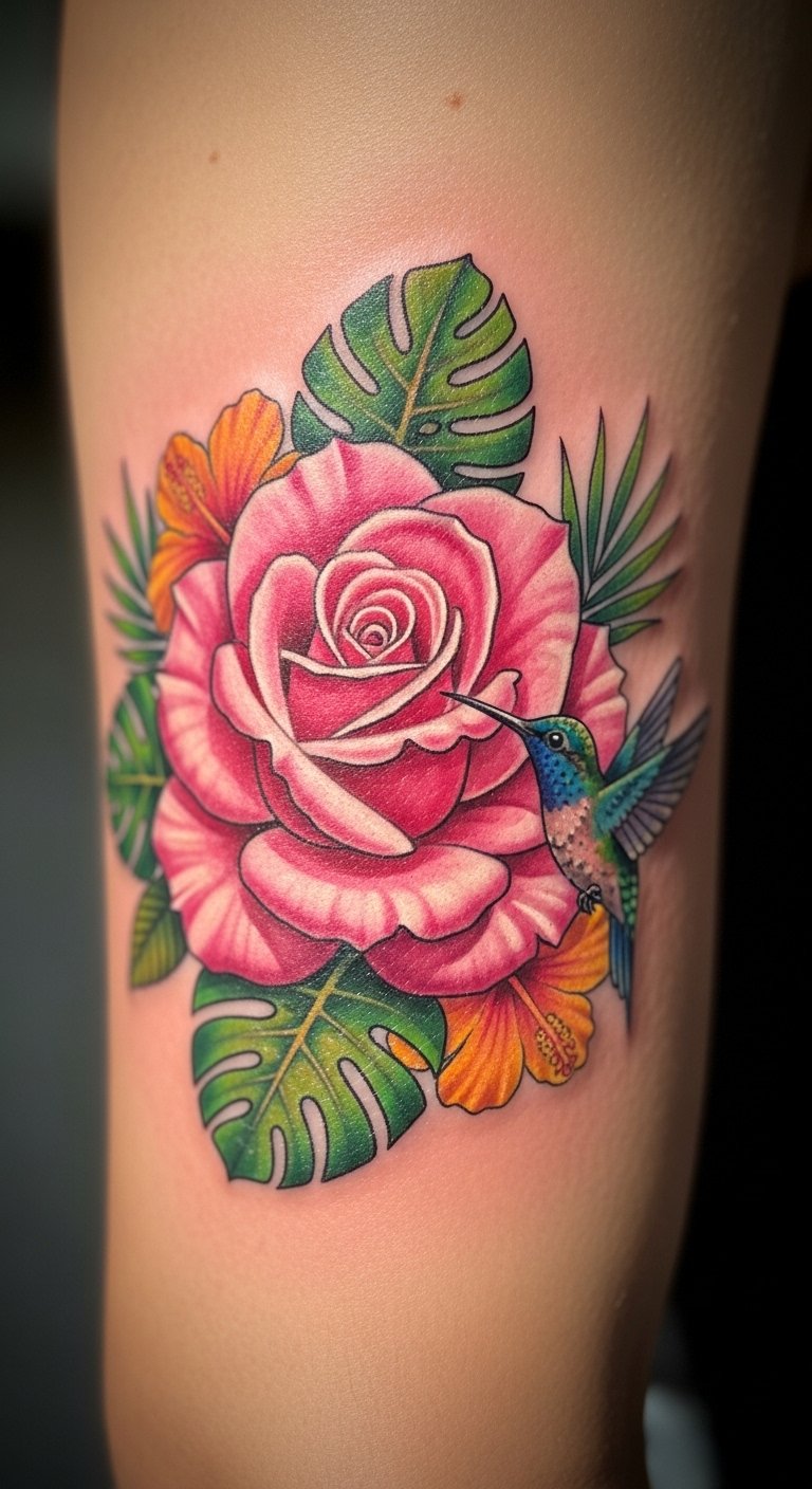 An exotic pink rose with elements brings global flair. See additions as cultural nods. Mix in motifs on paper. Budget with selective elements, about $150. Use free exotic templates. Place it for adventure. Add specific features, yourself. Look for theme deals. This tattoo fits world travelers, adding diversity. Try themed stickers. Choose vibrant extras. Find fusion artists. You’ll love the global touch. Focus on harmony. Draw from travels.