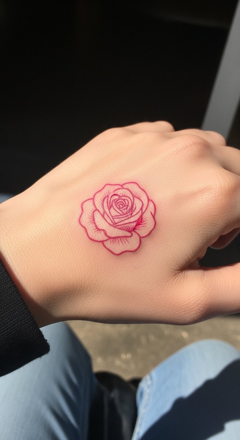 A simple pink rose on your hand offers straightforward charm. Think of it as an everyday accent. Draw it on your palm first. Budget with a basic hand design, under $90. Use free simple apps. Put it on the back for view. Add minimal details, yourself. Find hand specials. This tattoo fits daily life, always in sight. Try hand stamps. Choose soft lines. Seek quick artists. You’ll like the ease. Focus on basics. Sketch simply.