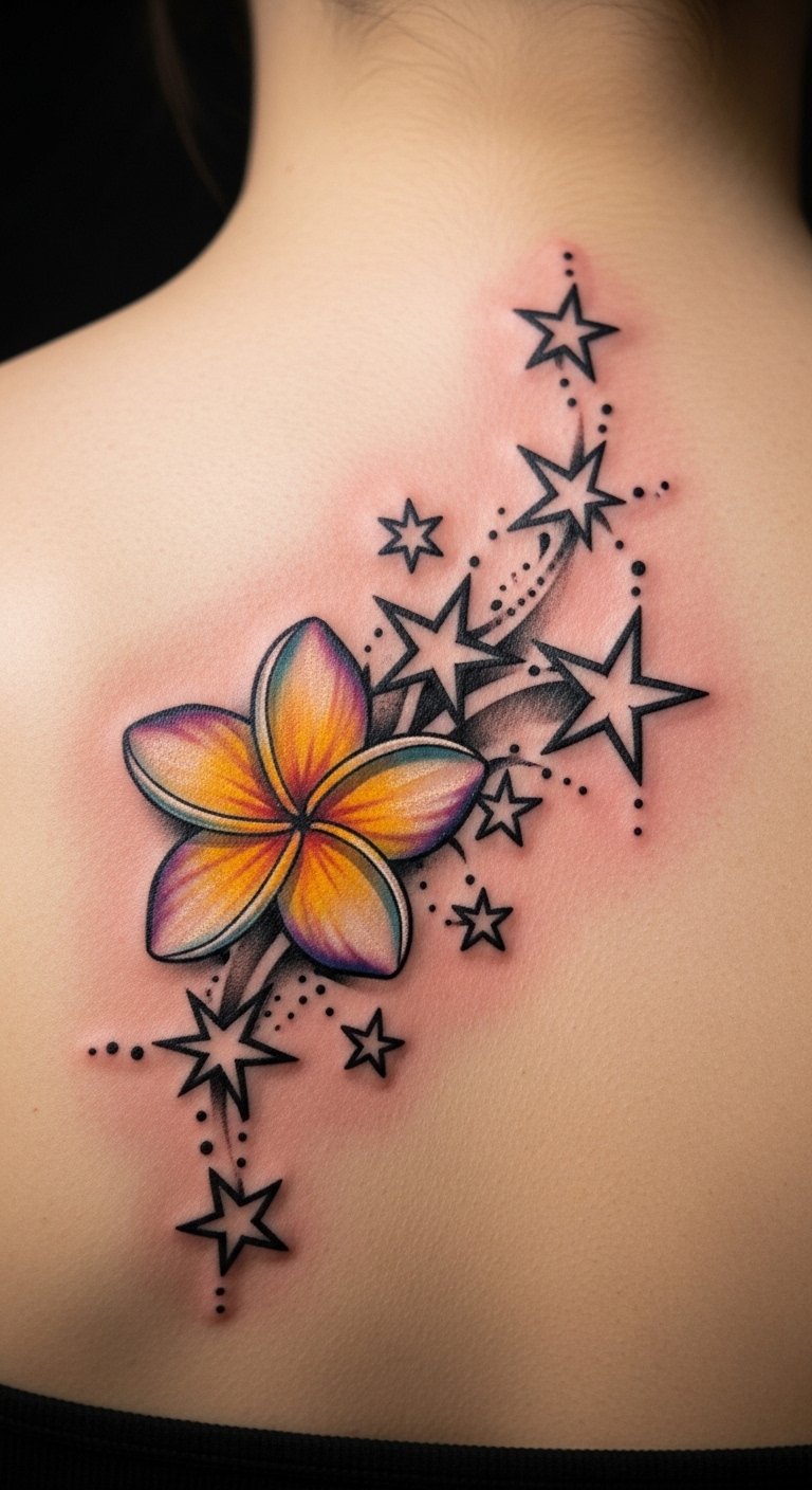 Plumeria tattoos mix with symbols like stars. They create balanced art. Choose this for harmony. Begin with pairing ideas. Free apps combine them. Test with drawings. Under $5. Add complementary shapes. Symbolic pairings enhance it. Go for the back. Sessions cost $100. Experiment at home.