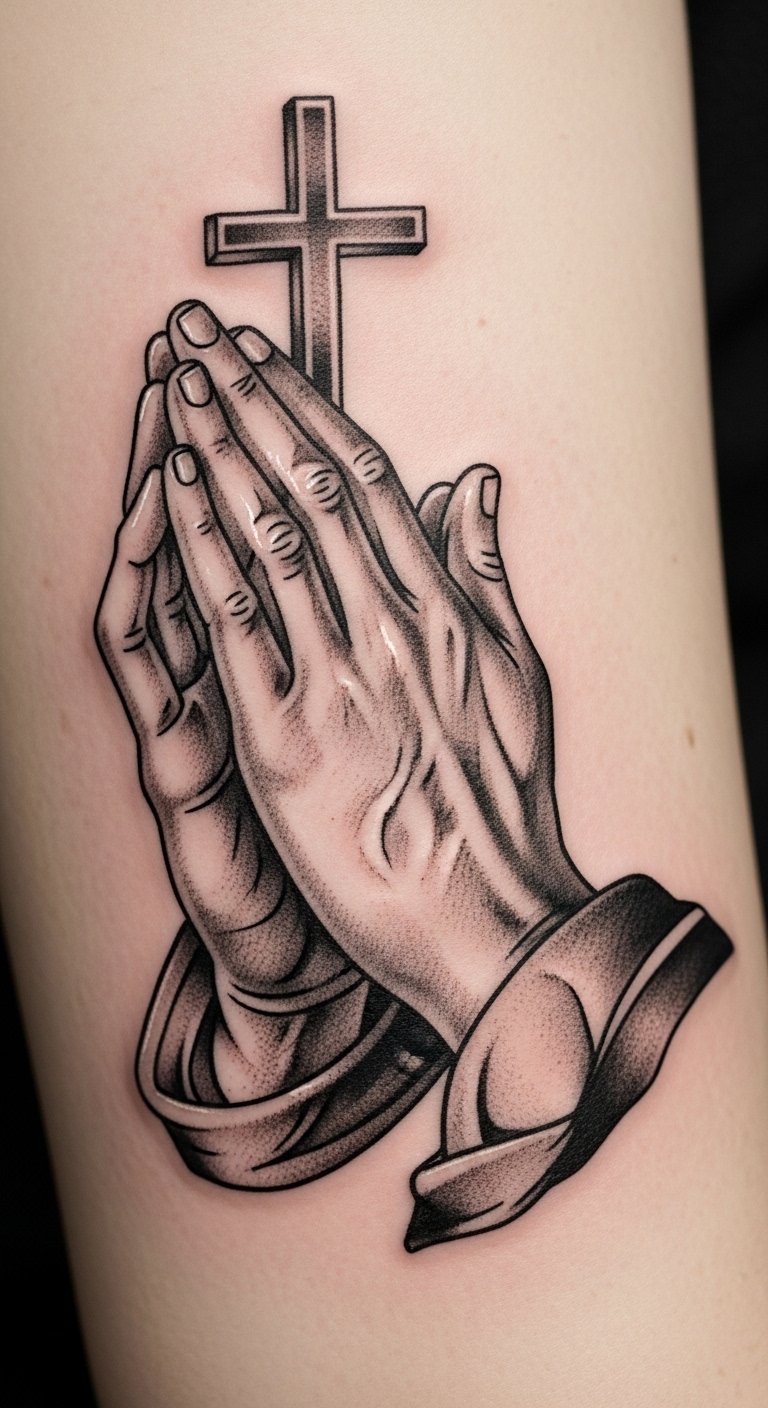 Picture clasped hands around a simple cross on your arm. This design draws from Christian traditions, showing quiet faith. Start by sketching it on paper first. Use free online apps to mix ideas. For a budget option, draw with a pen at home before visiting a shop. Keep ink basic to save money—black outlines work best. Add a small cross yourself in drawings to personalize. This setup reminds you of core values every day. Try placing it on your wrist for easy visibility. Mix in family symbols if you like. Get a friend to help trace designs cheaply. Focus on what matters most in your story.