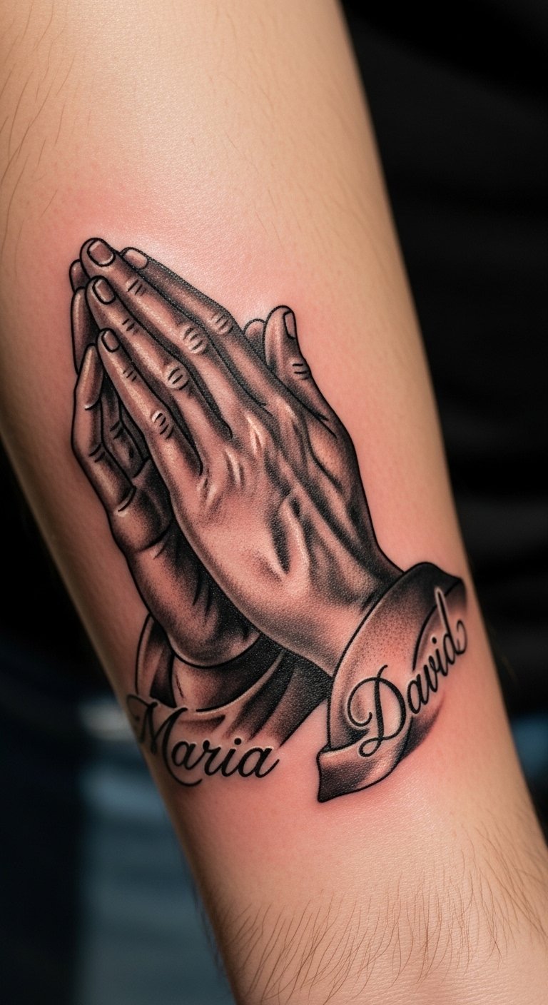 Hands in prayer with a loved one’s initials add heart. This honors memories in a touching style. Write names on paper to begin. Access free fonts online for designs. Keep text minimal to reduce costs. Place it near your heart for emotion. Use old photos as references for drawings. This design keeps connections alive. Share concepts with close ones simply. Adjust details with ease.