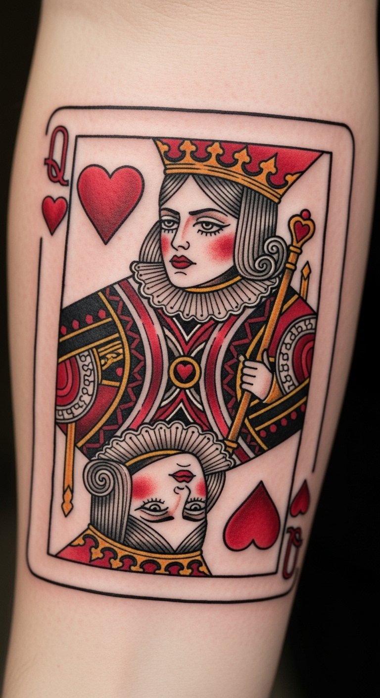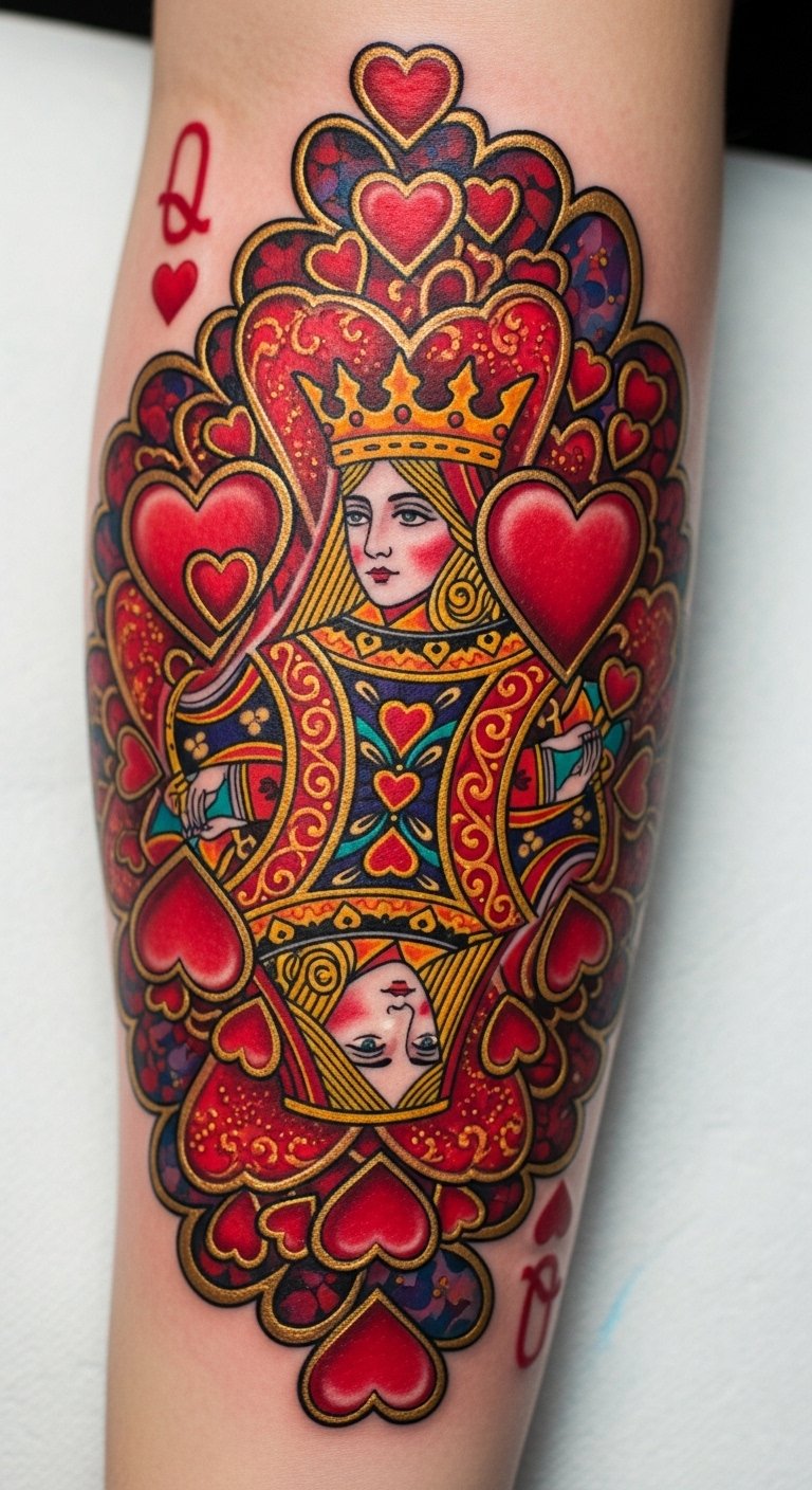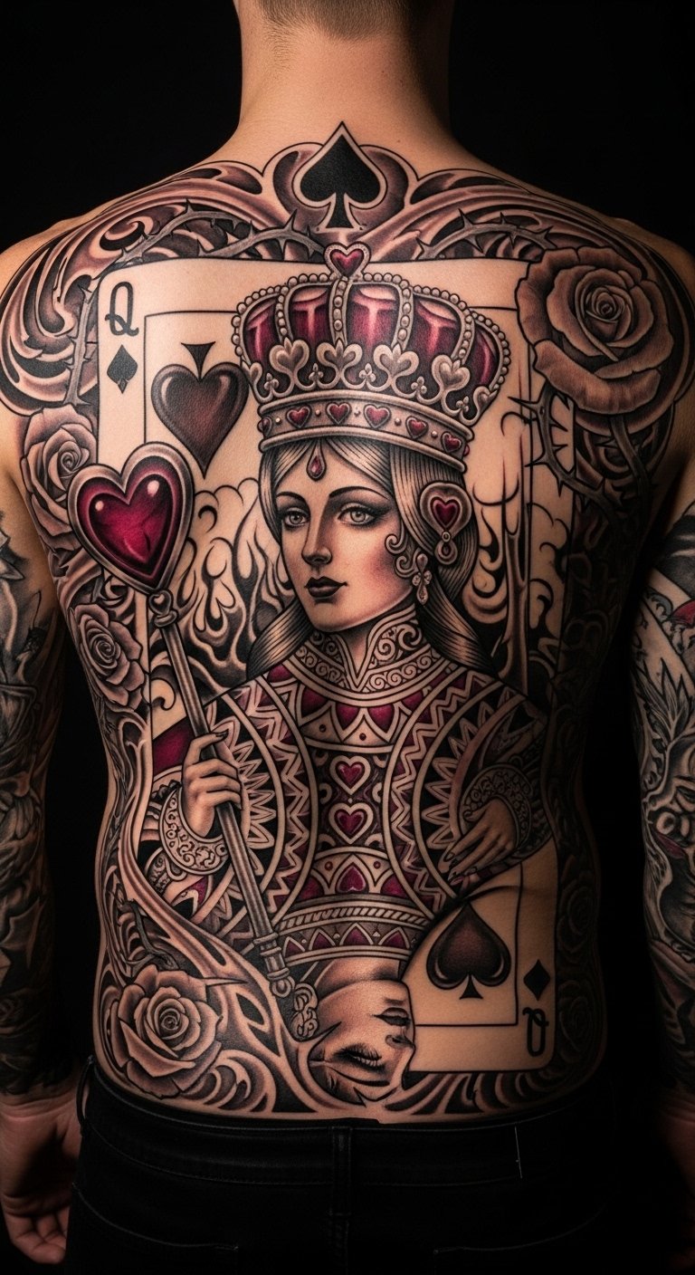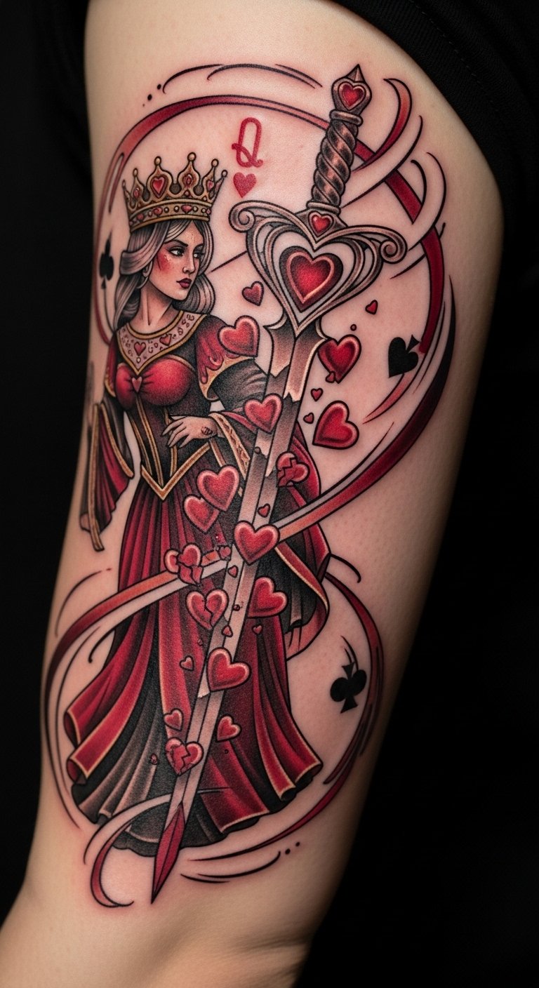 A chest design places the Queen of Hearts near your heart for real emotion. It represents inner power with elegant curves. Sketch it on a mirror with soap for a quick view. Use affordable chest decals to test the spot. This location keeps it personal yet meaningful. Choose basic inks to save money. DIY by adding a heart shape with everyday markers. It’s about that core feeling. Start small to build up. Practice on paper to get it just right.
