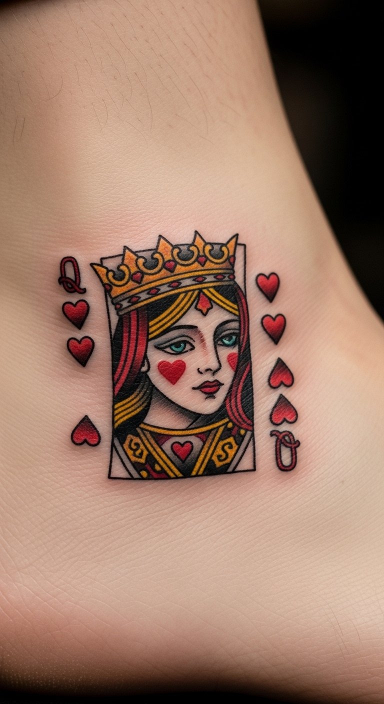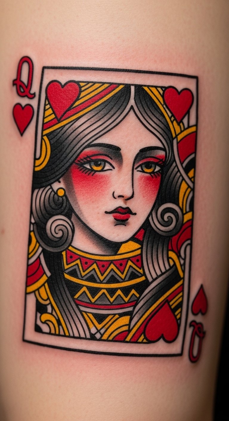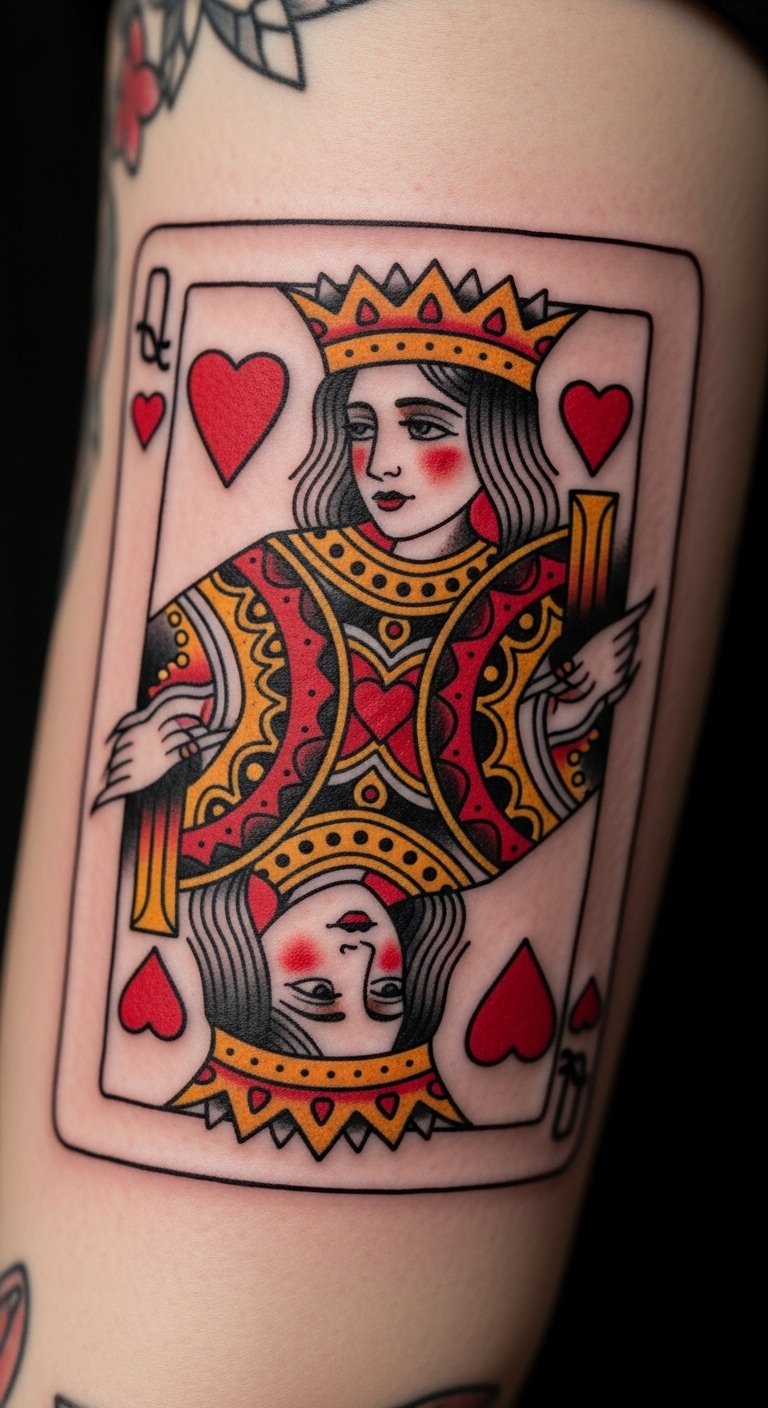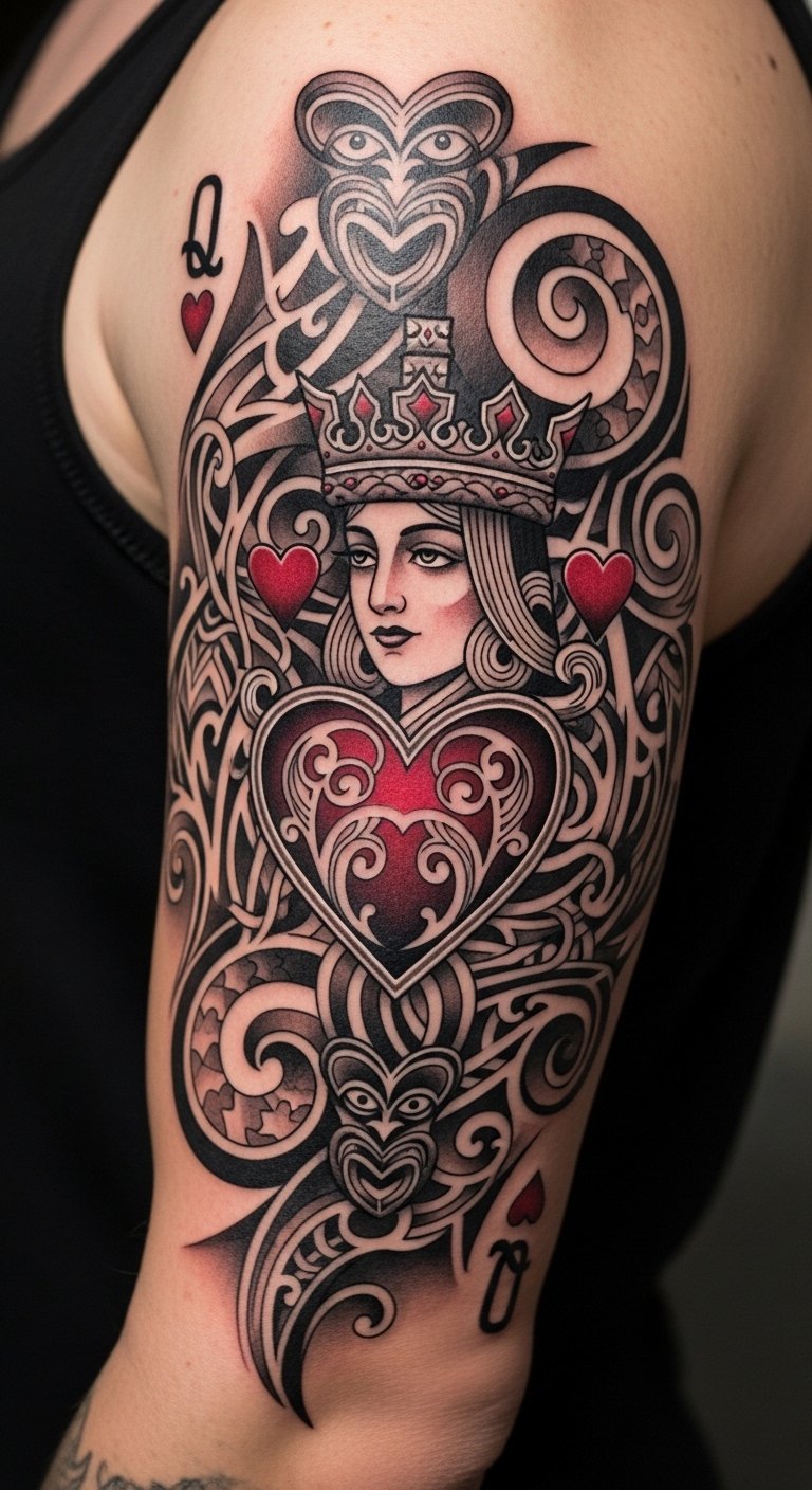 A chest design places the Queen of Hearts near your heart for real emotion. It represents inner power with elegant curves. Sketch it on a mirror with soap for a quick view. Use affordable chest decals to test the spot. This location keeps it personal yet meaningful. Choose basic inks to save money. DIY by adding a heart shape with everyday markers. It’s about that core feeling. Start small to build up. Practice on paper to get it just right.