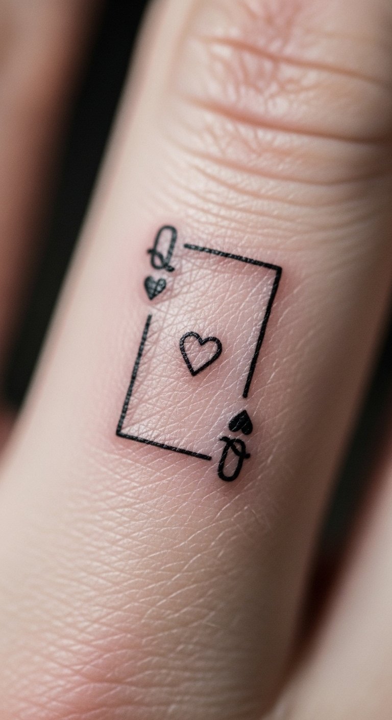 A finger tattoo keeps things close and personal, like a secret promise. The Queen of Hearts here means deep bonds with just a tiny heart. Use a free online template to sketch ideas at your desk. Try temporary finger bands from the pharmacy for under five bucks. This spot shows commitment without overwhelming your hand. Go for a basic outline to cut costs on ink. Add a dot yourself with a fine pen during practice. It’s perfect for quiet expressions. Keep sessions short for less hassle. Start with paper trials to nail the size.