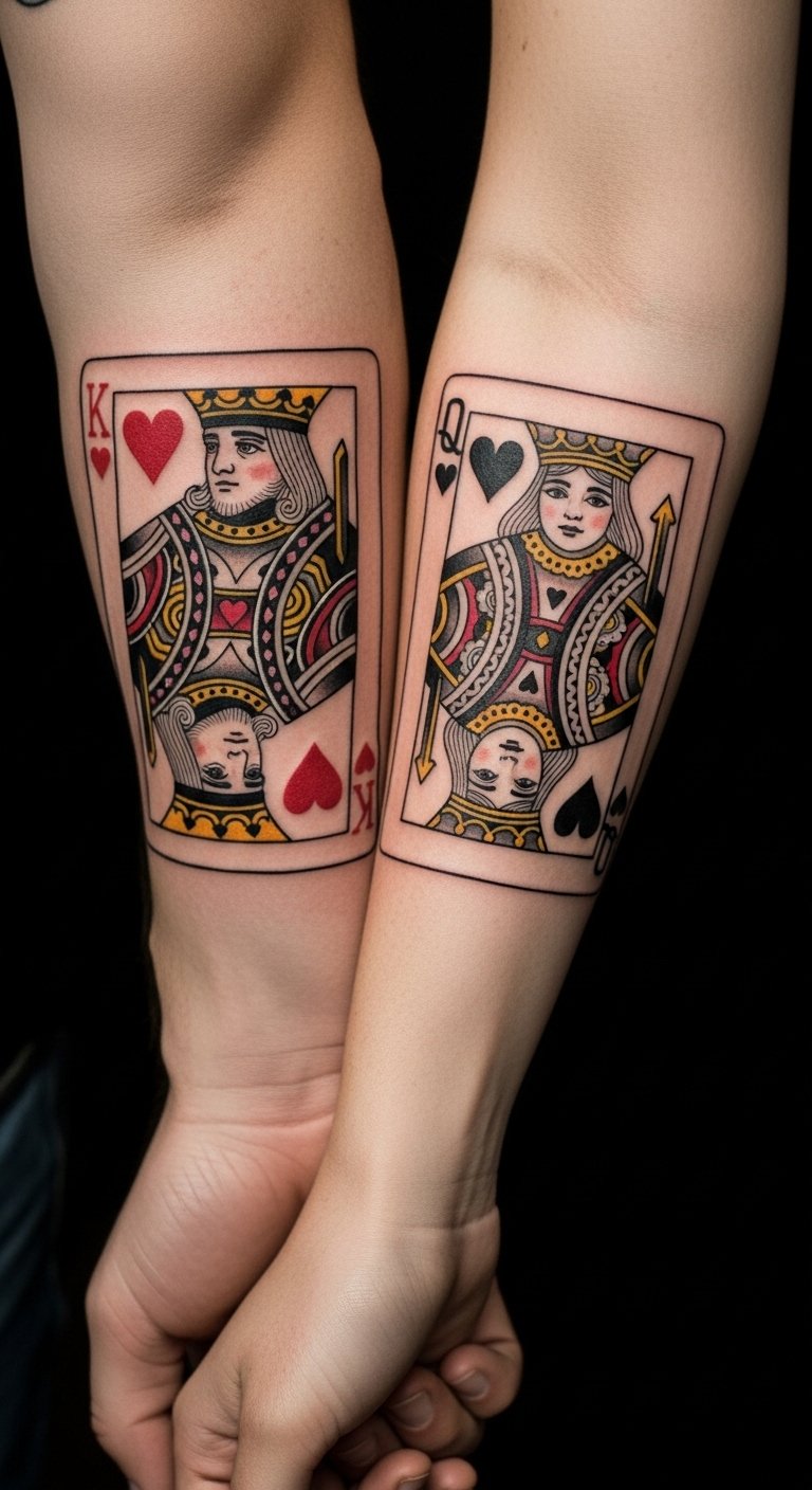 For couples, matching tattoos link you with a Queen and King pair. It stands for unity through similar hearts. Draw both on paper together as a fun activity. Use paired temporary sets from budget stores. Place them on arms for easy matching. Stick to simple designs to share the expense. DIY by swapping sketches at home. This builds your bond. Plan it over coffee for low stress. Test with stickers first.