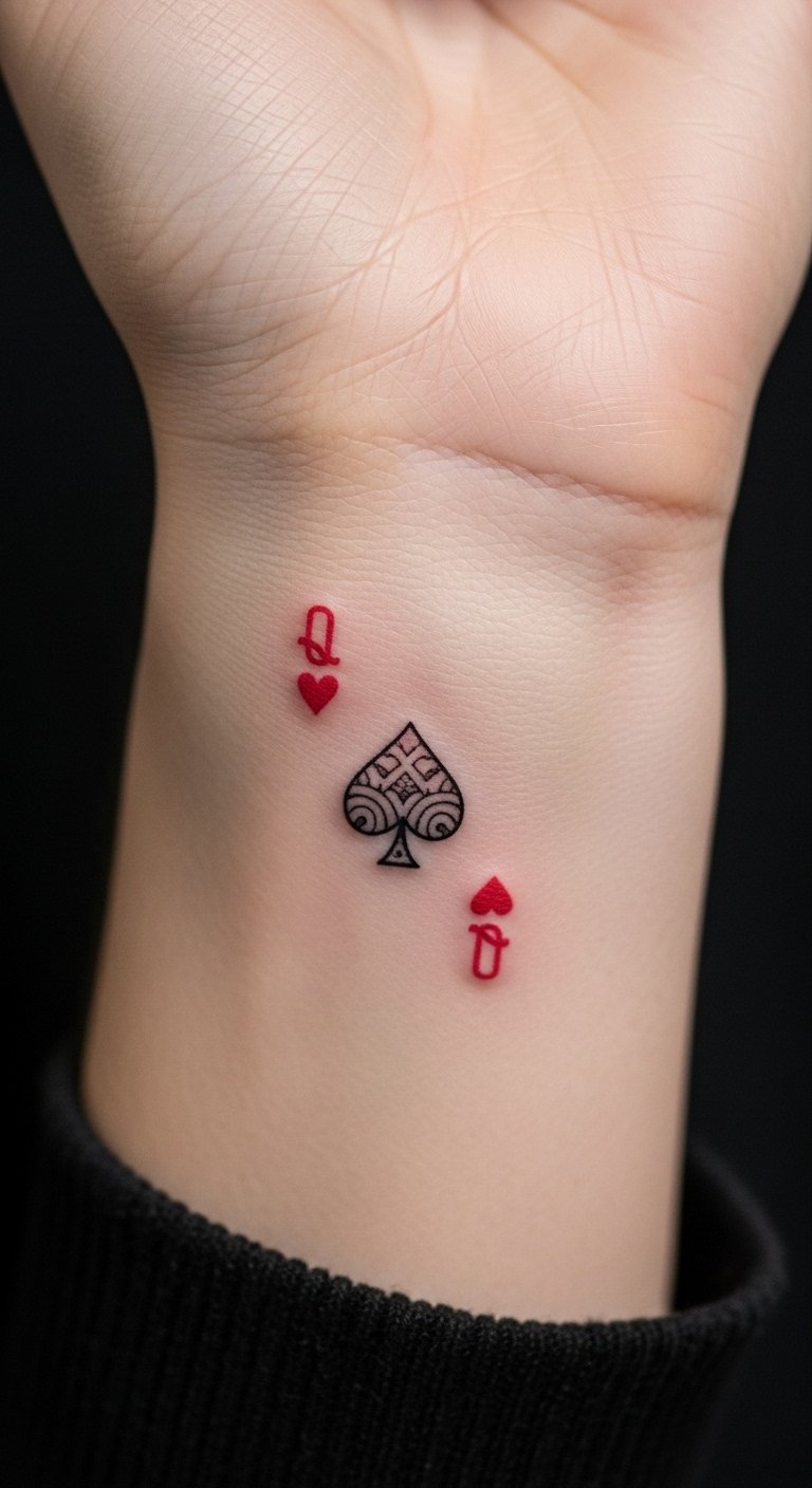 Think of the classic Queen of Hearts as your go-to symbol for timeless romance. This design pulls from old playing cards with a simple crown and heart. Start by sketching it on paper to see how it fits. Use a temporary tattoo kit from the dollar store to test it out. Pick a spot like your wrist for easy daily wear. Keep costs low by visiting a local artist during off-peak hours. Add your own twist, like a small heart dot, with a home marker practice. This way, you make it yours without extra cash. Short sessions help avoid discomfort. Go for black ink if you’re on a budget. It’s all about that strong, personal statement on your skin.