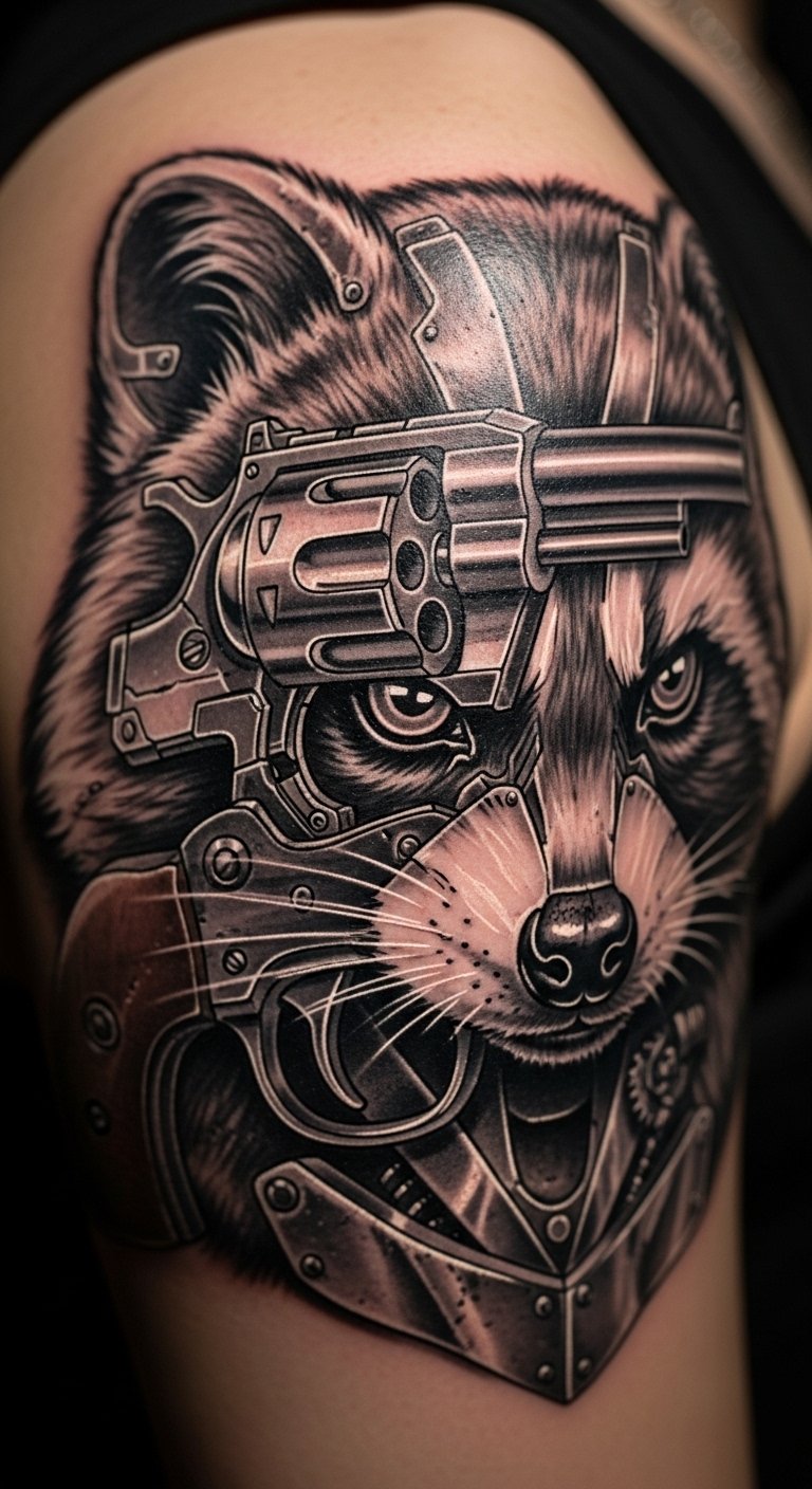Picture a raccoon holding tiny guns. It adds an edgy twist. Draw it at home with a pen and paper. Find cheap stencils online for under $10. Place guns near the paws for balance. This fits adventure lovers. Chat with a friend who’s into art for feedback. Use affordable markers to test ideas. Keep it small to cut tattoo costs. Aim for a local shop with deals. This design mixes playfulness and strength. Try adding stars around it. You’ll create something unique without spending much.