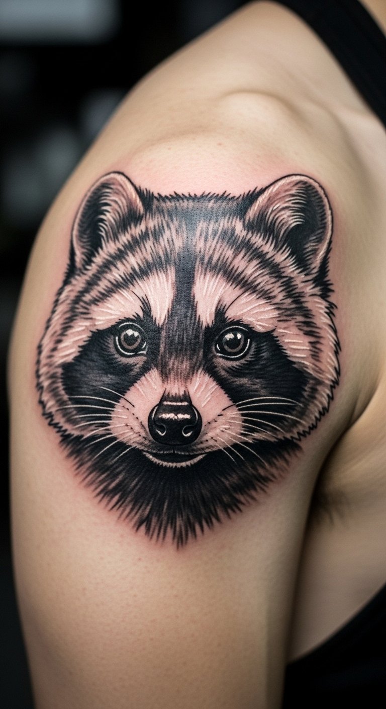 Opt for the shoulder to frame your raccoon. It flows with your body. Draw around the joint. Free tutorials help. Add flowing elements like tails. This enhances movement. Use shoulder stencils cheaply. Place it high for partial hide. Seek group session discounts. This idea makes a statement. Focus on simple lines. You’ll love the fit without extra cost.