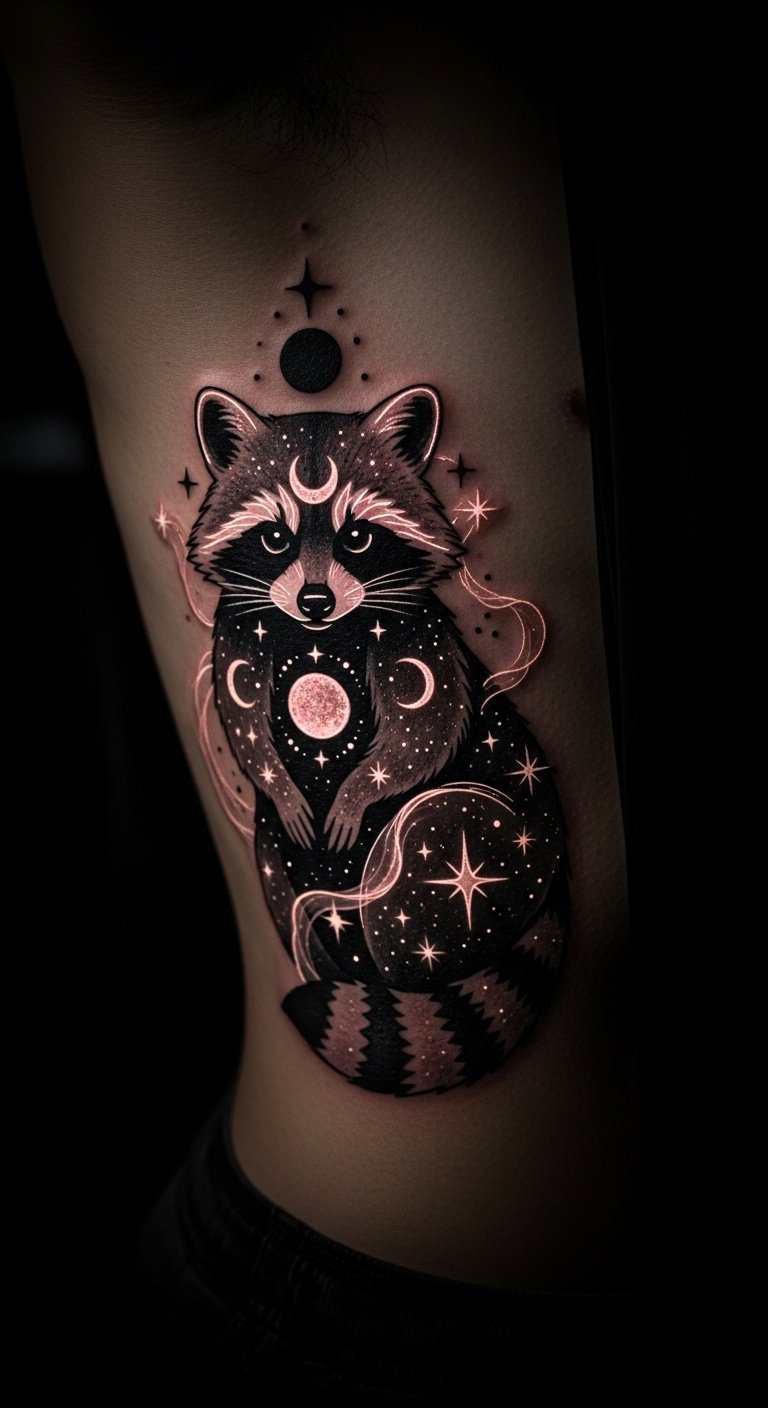 Blend magic with your raccoon. It adds wonder. Sketch stars around it. Free fantasy apps guide you. Include glowing eyes. This appeals to dreamers. Test with glow stickers. They are affordable. Put it on your rib for intimacy. Look for themed artists. This design sparks imagination. Keep additions light. You’ll create magic on a budget.
