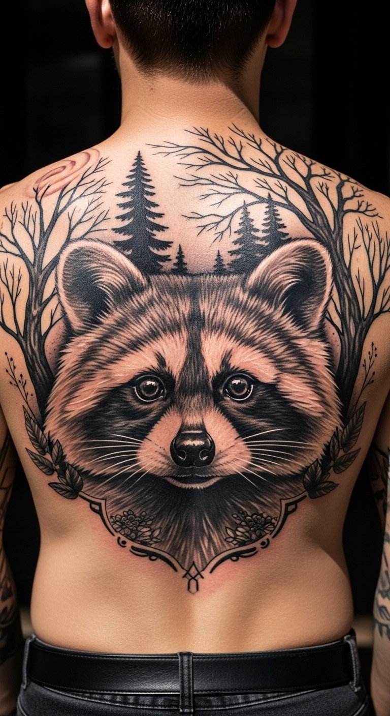 Combine with nature scenes. It tells a story. Draw trees or leaves. Free nature apps assist. Place raccoon in the center. This evokes outdoors. Use leaf stencils cheaply. Put it on your back for space. Look for nature-themed deals. This design is immersive. Keep details natural. You’ll enjoy the scene.