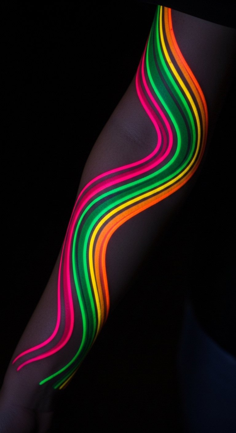 Neon arms make your tattoo stand out under any light. Think glowing greens and pinks that pop. Start with a medium size on your forearm for about $80. Mix in household fluorescent markers to sketch ideas at home. This gives you a cheap way to test the look. Seek artists with neon specials to save cash. Focus on two bold colors to keep it straightforward. Place it where clothes hide it if you’re cautious. Use simple shapes like straight lines for quick sessions. It’ll heal fast with basic care. Add glow-in-the-dark elements for extra fun without extra cost. You can adapt this for events like parties.
