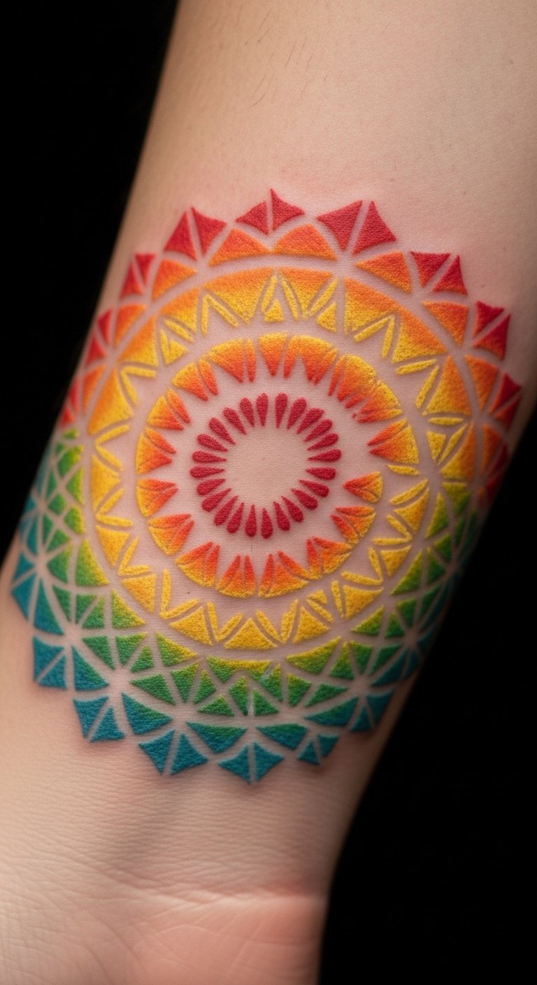 Mandala circles mix symmetry with color. They create a balanced rainbow effect. Go for a mini design on your wrist, around $55. Practice drawing mandalas with pencils at home. It’s a simple way to test. Look for group tattoo days for deals. Use basic shapes to keep costs down. Place it for easy viewing. It’ll bring calm to your routine. Free templates online speed up planning.