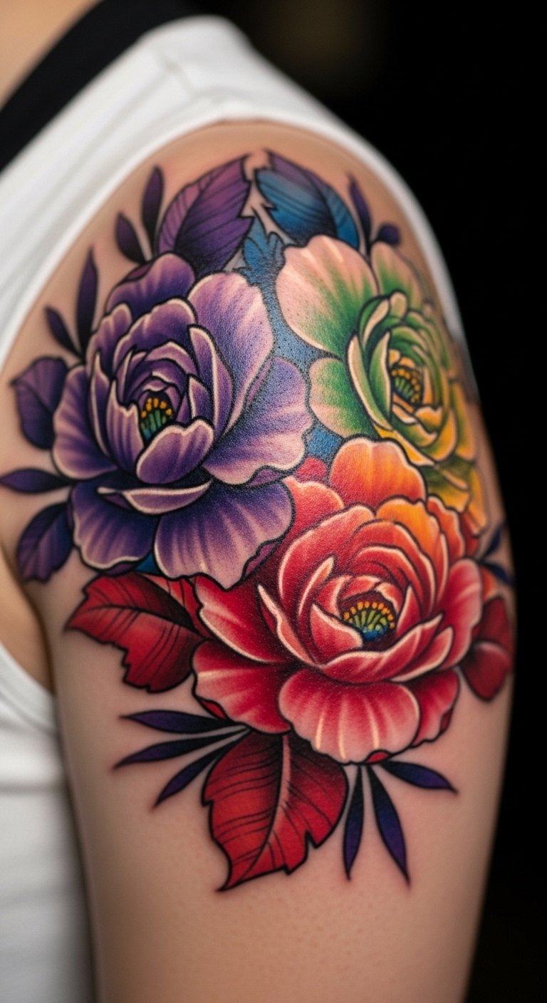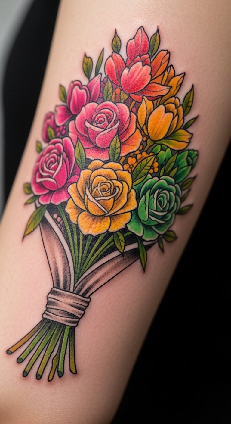 Floral bouquets bloom with rainbow hues. They mix flowers and colors. Go for a small bunch on your shoulder, about $65. Draw flowers with markers at home for ideas. This saves money upfront. Look for floral promo sessions. Keep designs basic for affordability. Position it for aesthetic appeal. It’ll brighten your day. Free floral apps assist planning.