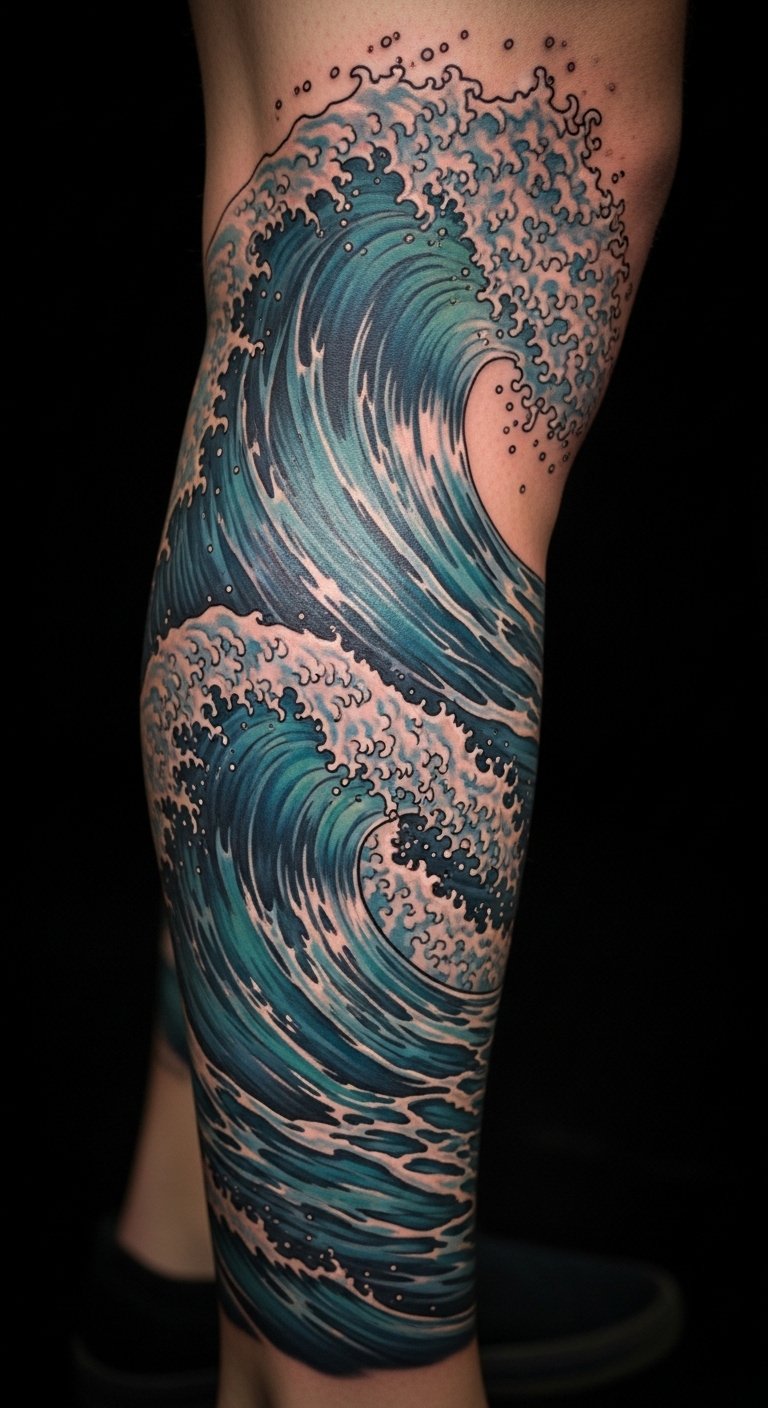 Leg sleeve tattoos wrap your leg in art. Imagine waves that look like they’re crashing. Draw the flow on paper with lines. This helps without spending. Find sleeve deals online for better rates. Start with one section to manage costs. These designs flow with you. Do a simple sketch first. Keep it actionable.
