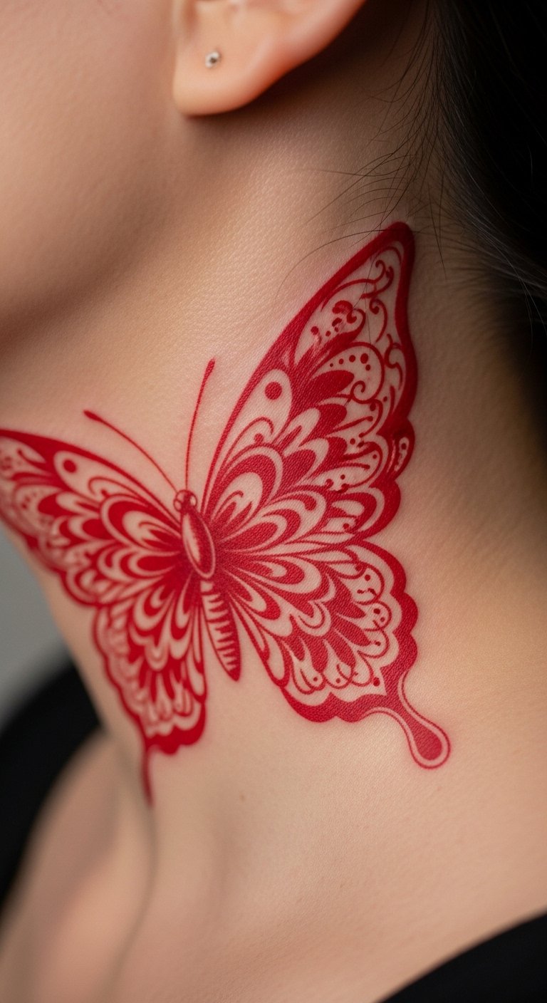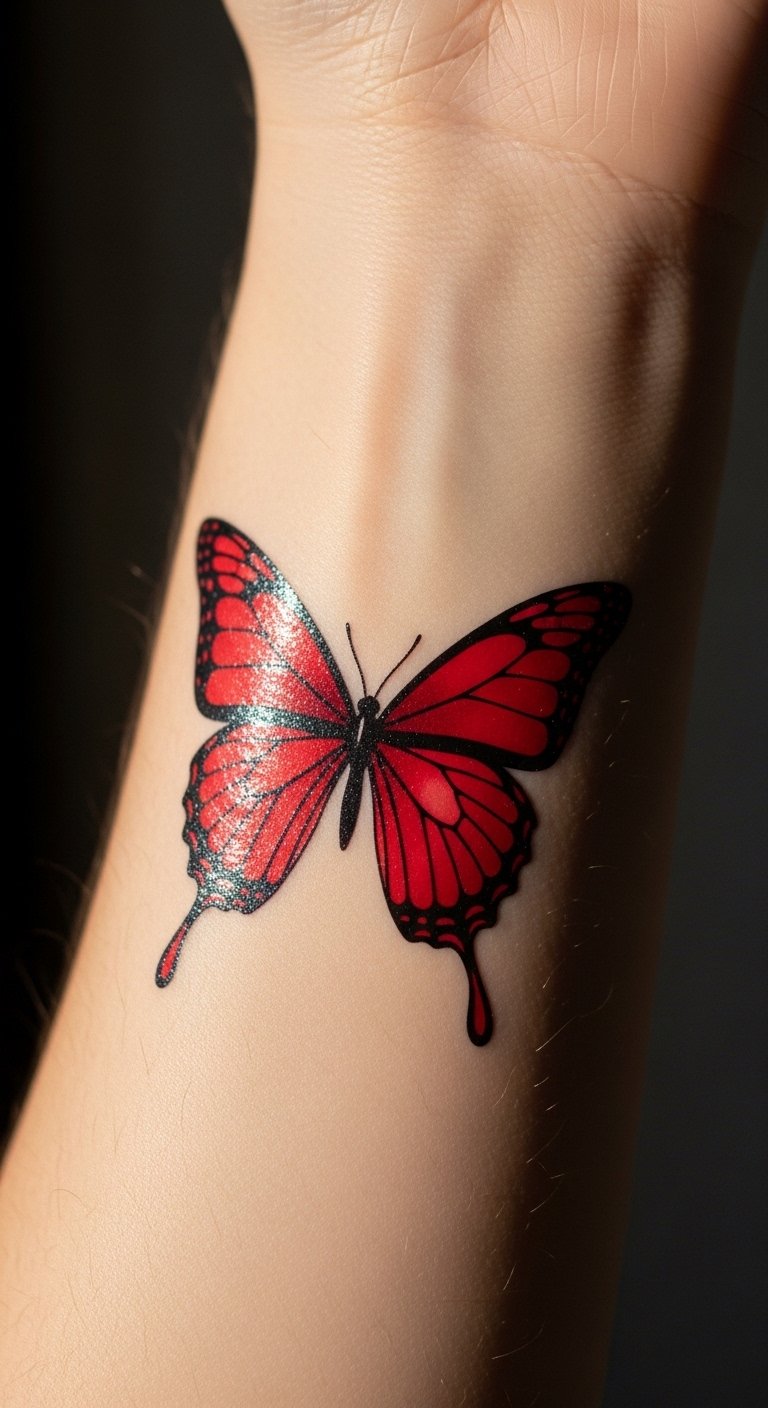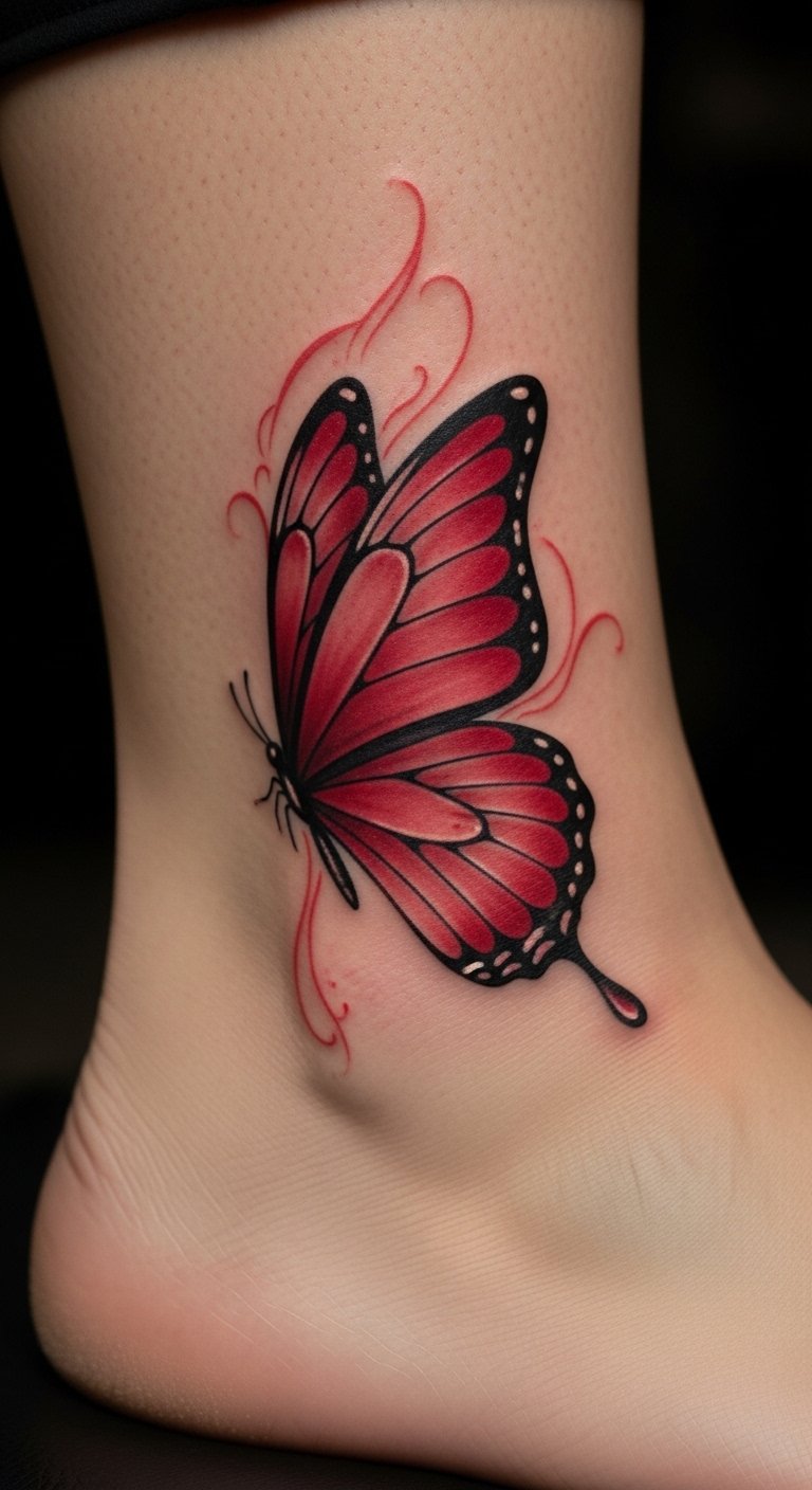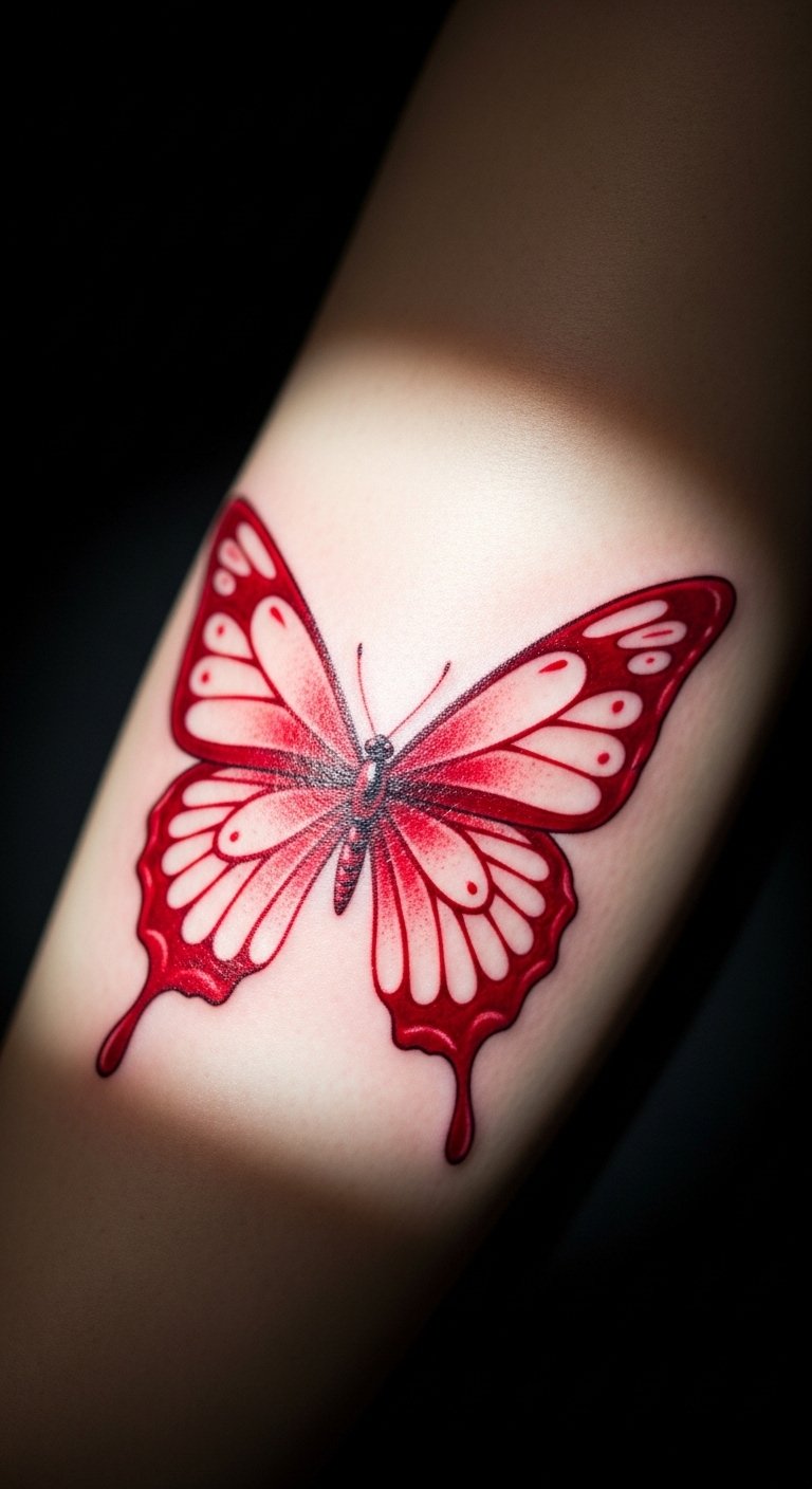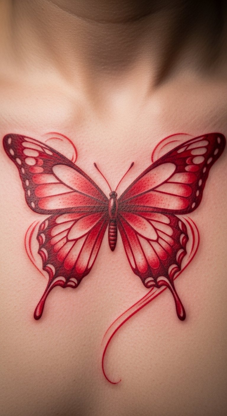 Red butterfly tattoos often stand for fiery passion and love. Think of it as a bold way to wear your heart on your sleeve.