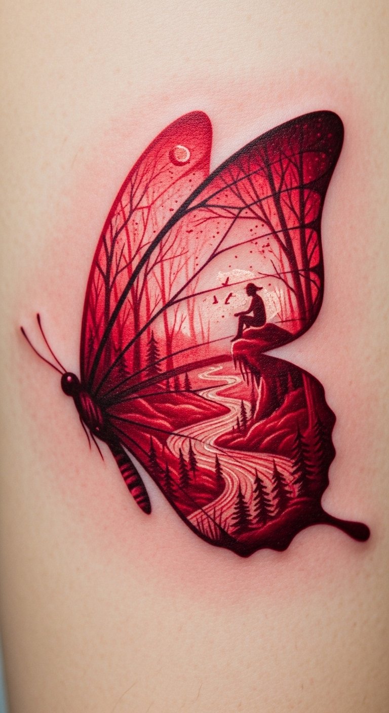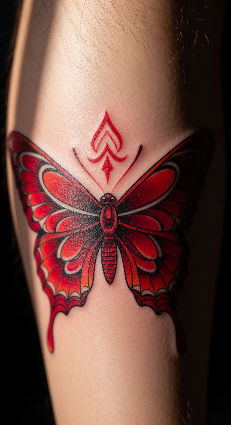 This tattoo highlights strength hidden in vulnerability, blending red’s energy with butterfly grace.
