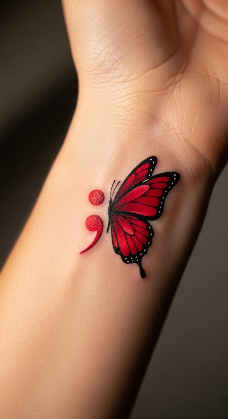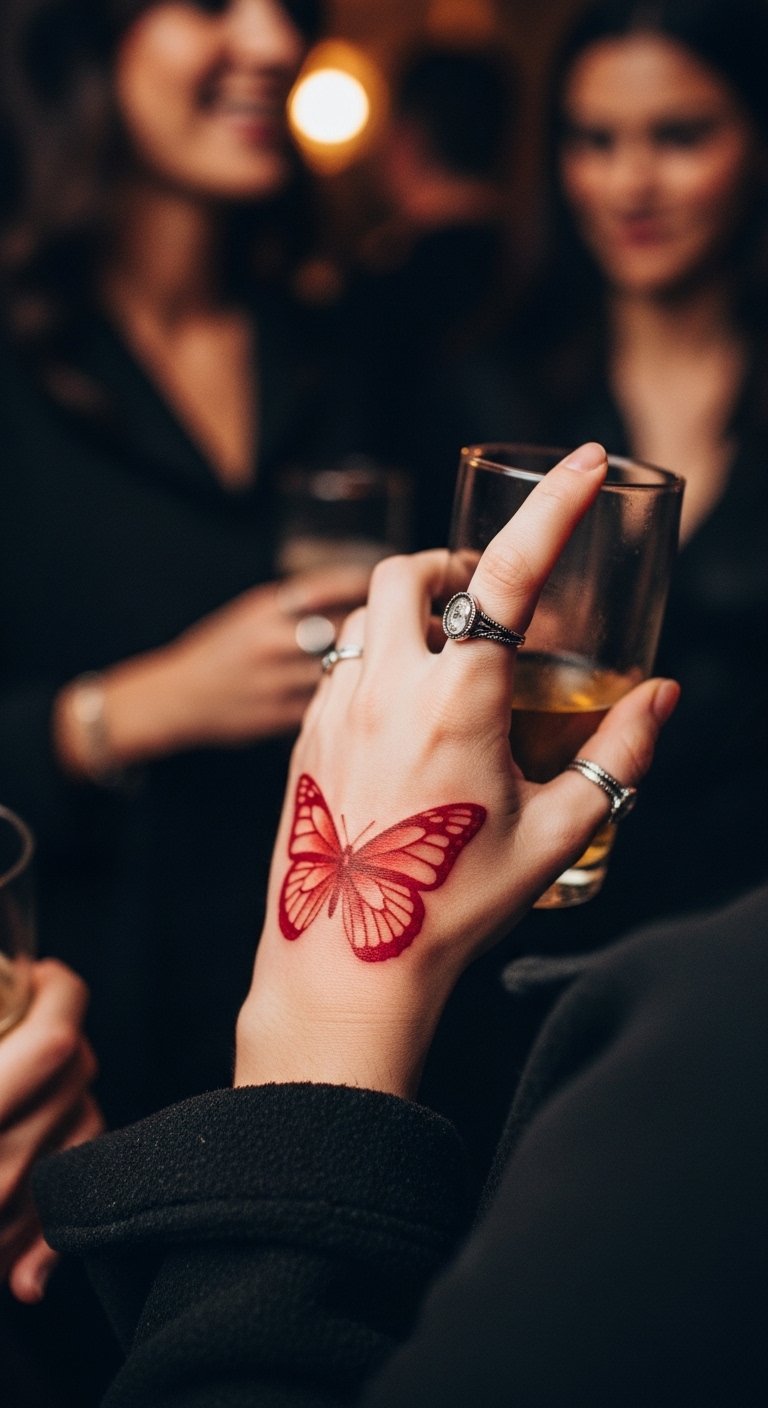 A red butterfly tattoo marks personal change, like emerging from tough times stronger.
