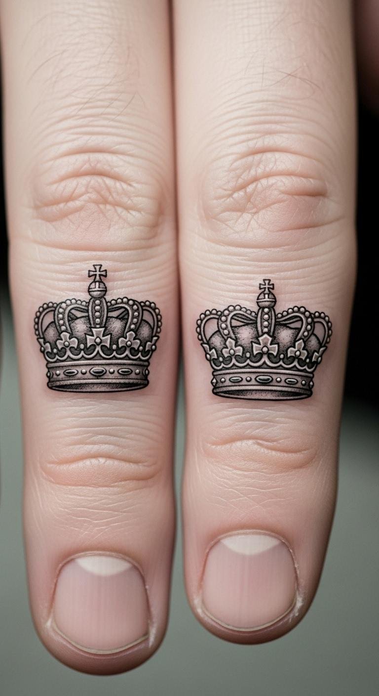 King and queen crowns add a royal touch, symbolizing partnership in style. One for him, one for her.